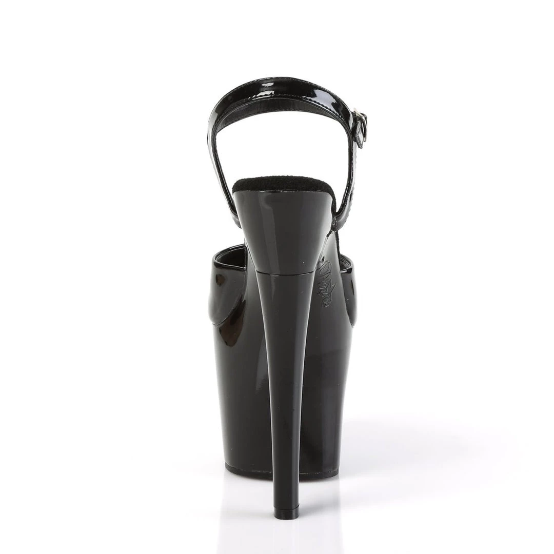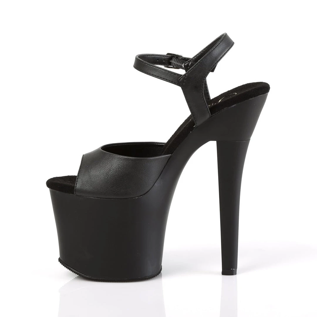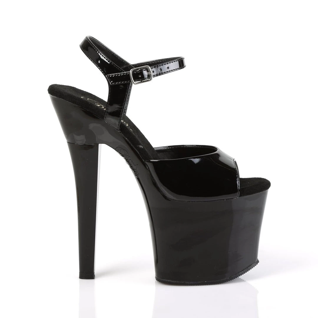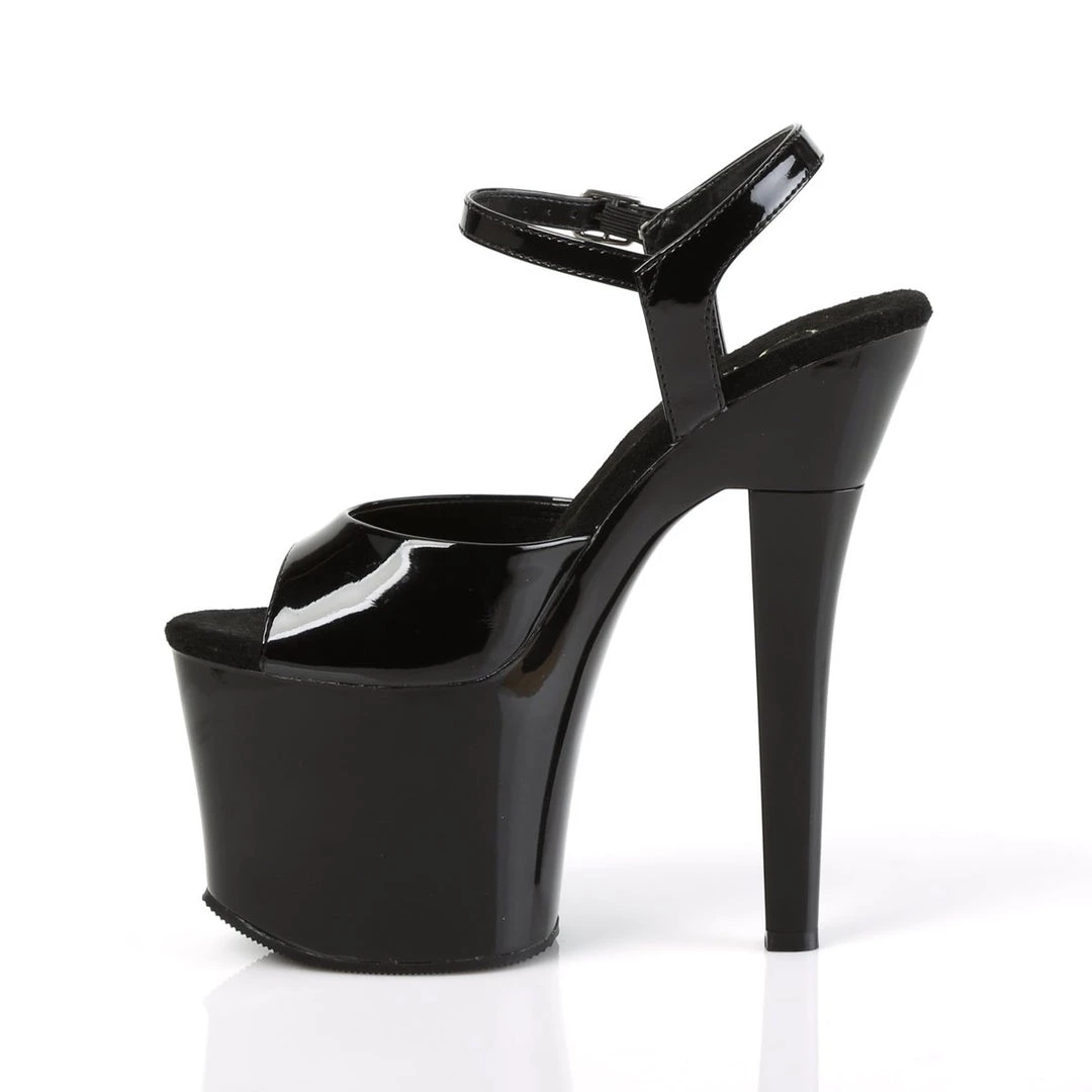 Sexy 7″ (178mm) heel, 3 1/4 (83mm) platform ankle strap sandal with chrome plated platform bottom.