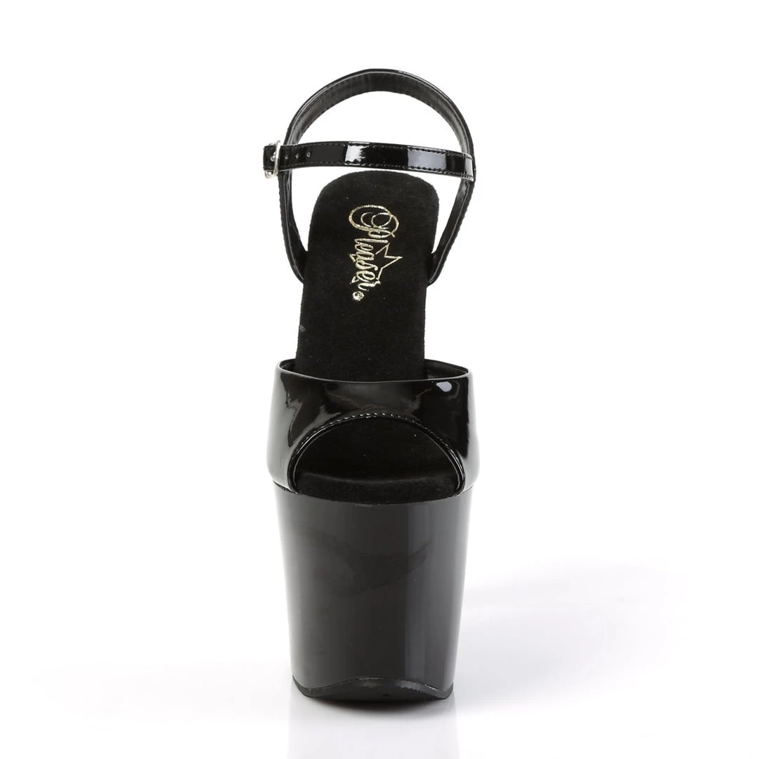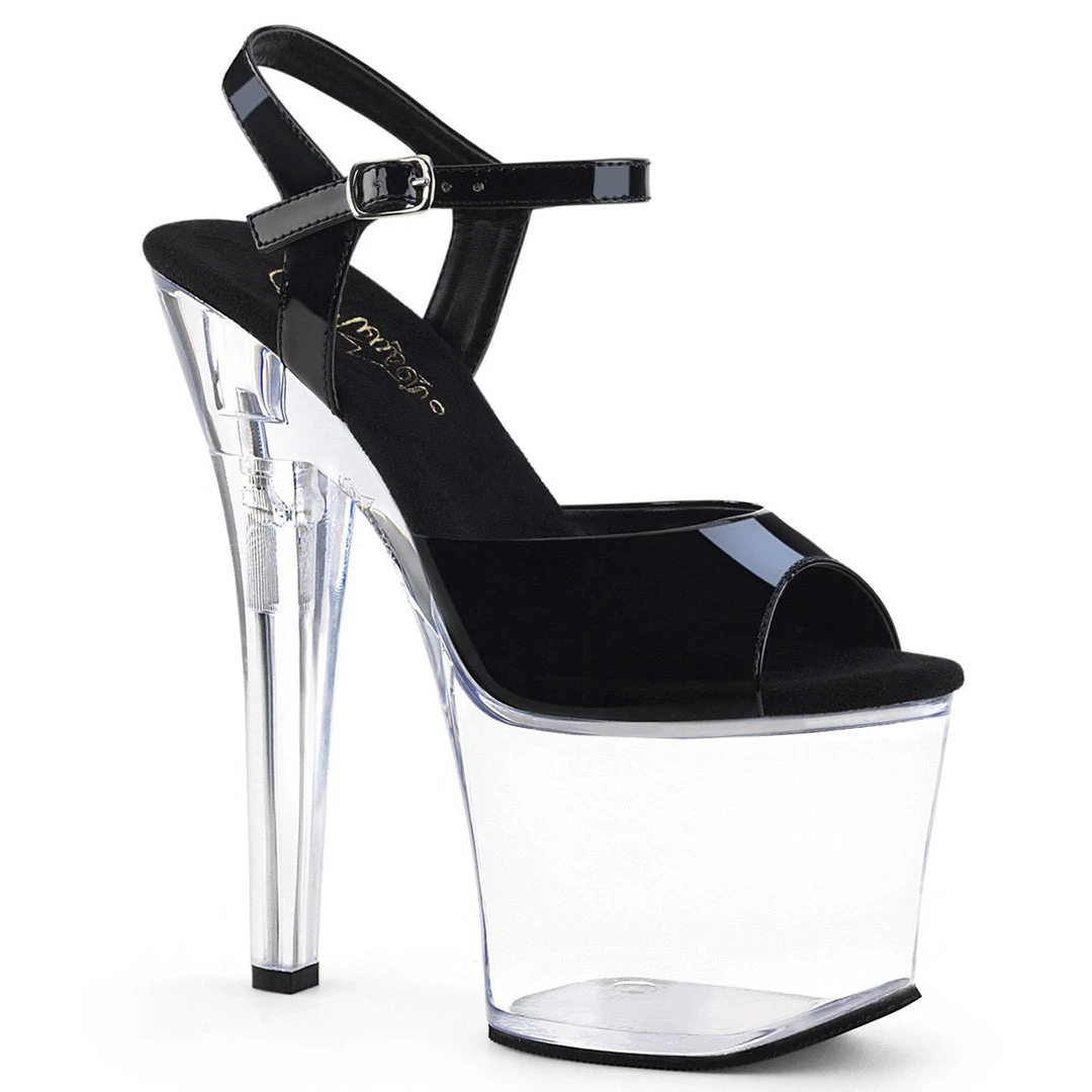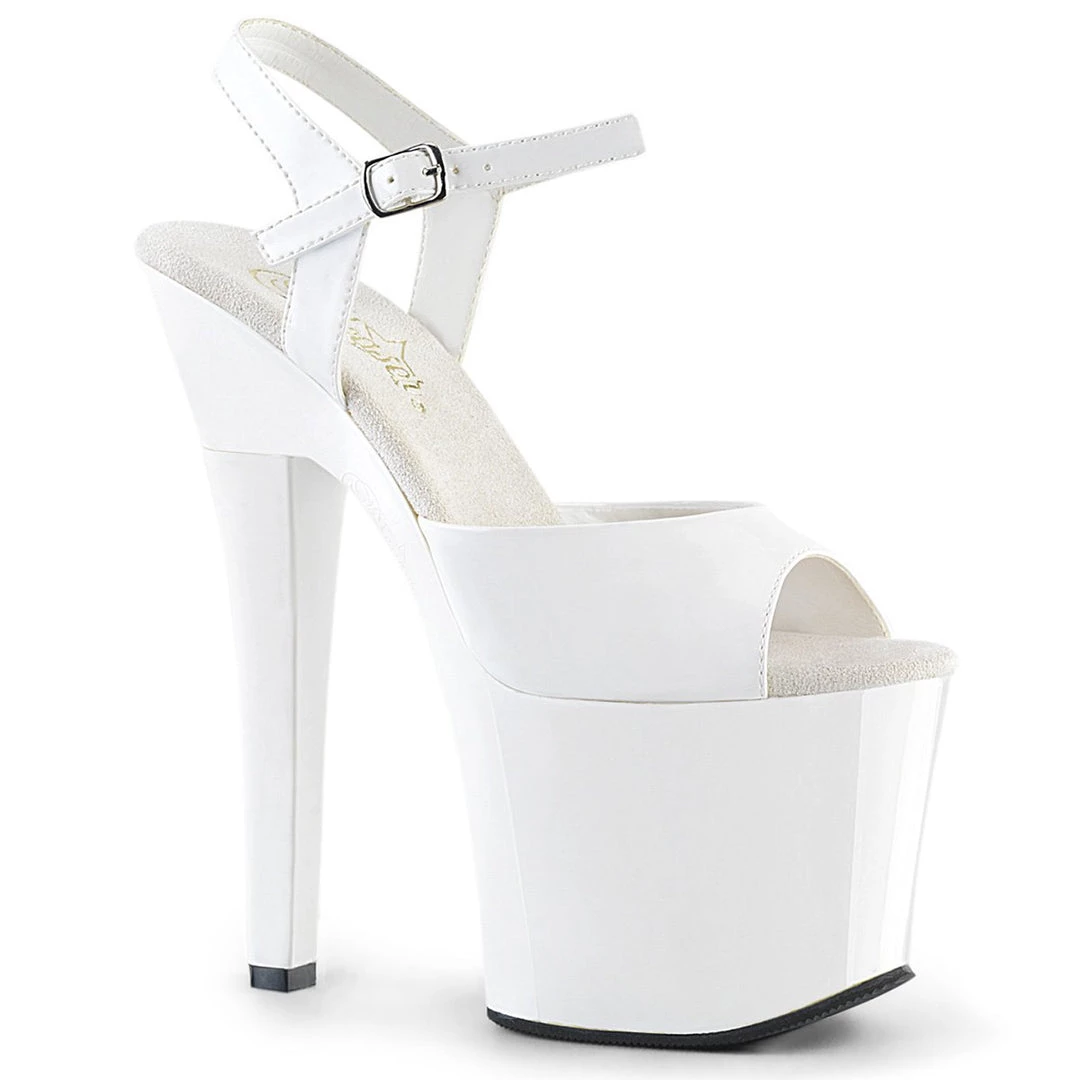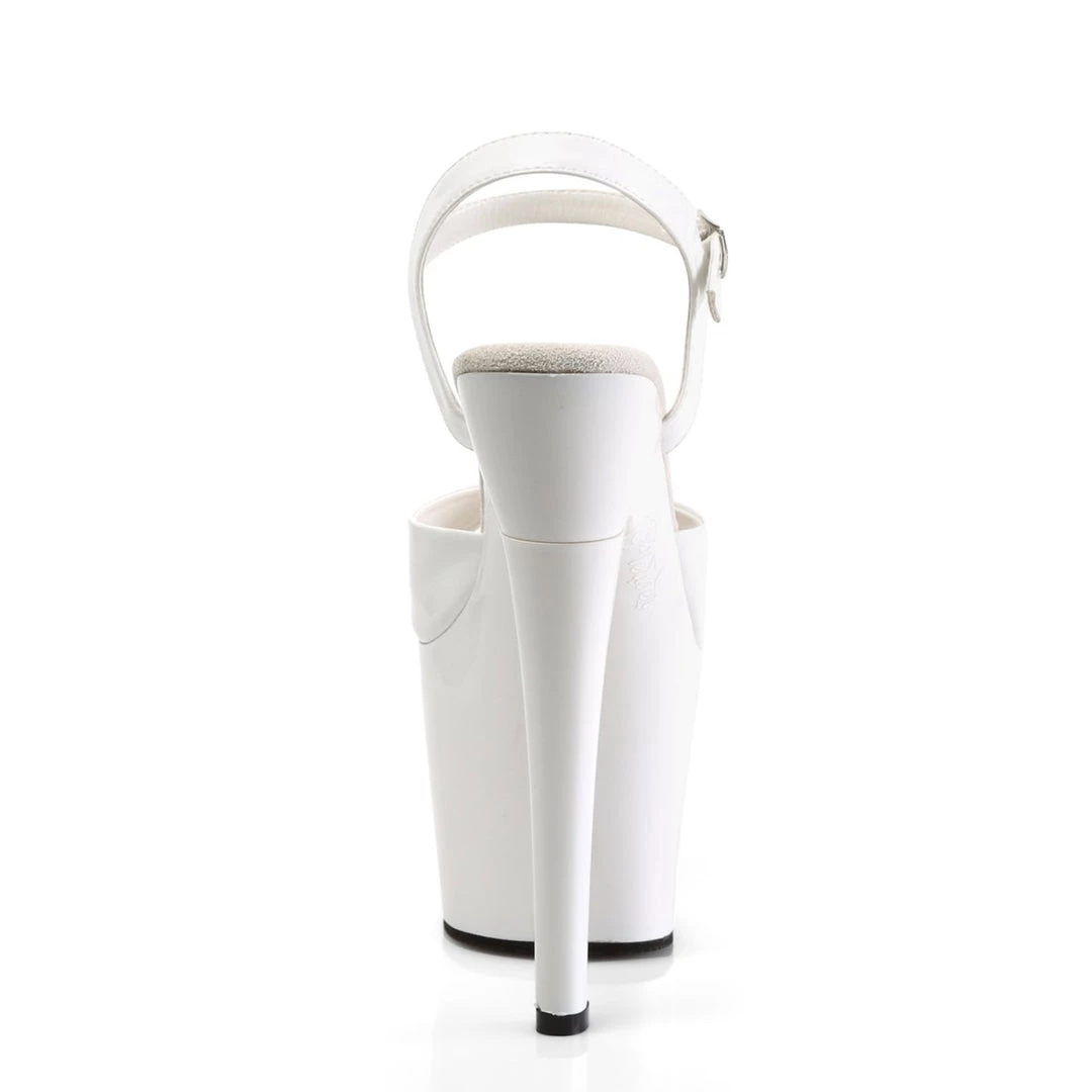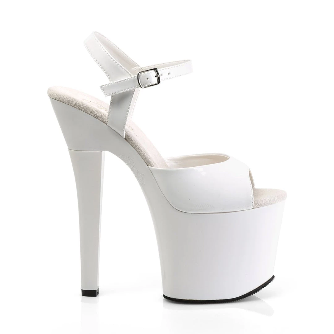 Sexy 7″ (178mm) heel, 3 1/4 (83mm) platform ankle strap sandal with chrome plated platform bottom.
