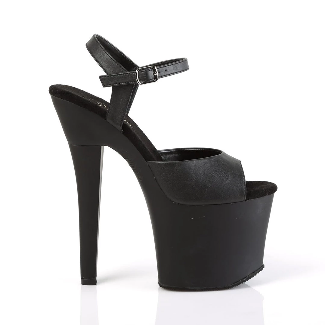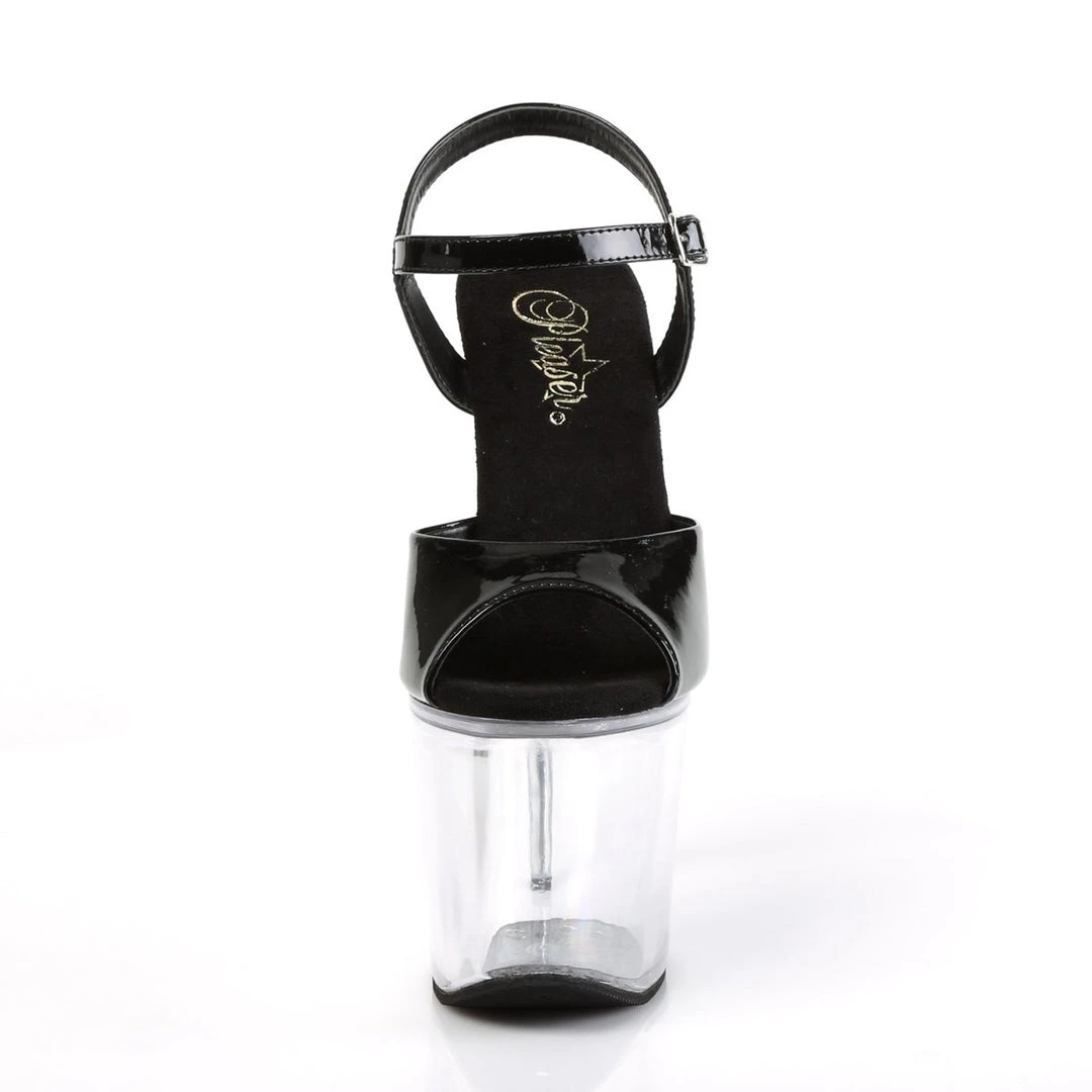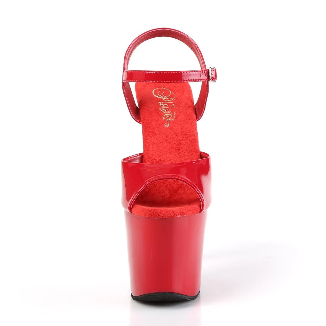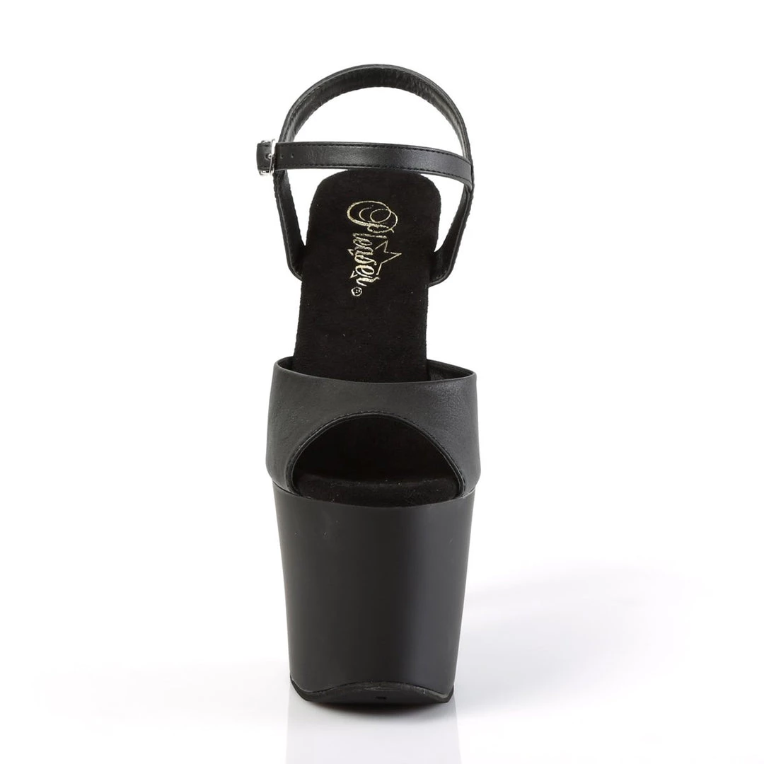 Sexy 7″ (178mm) heel, 3 1/4 (83mm) platform ankle strap sandal with chrome plated platform bottom.