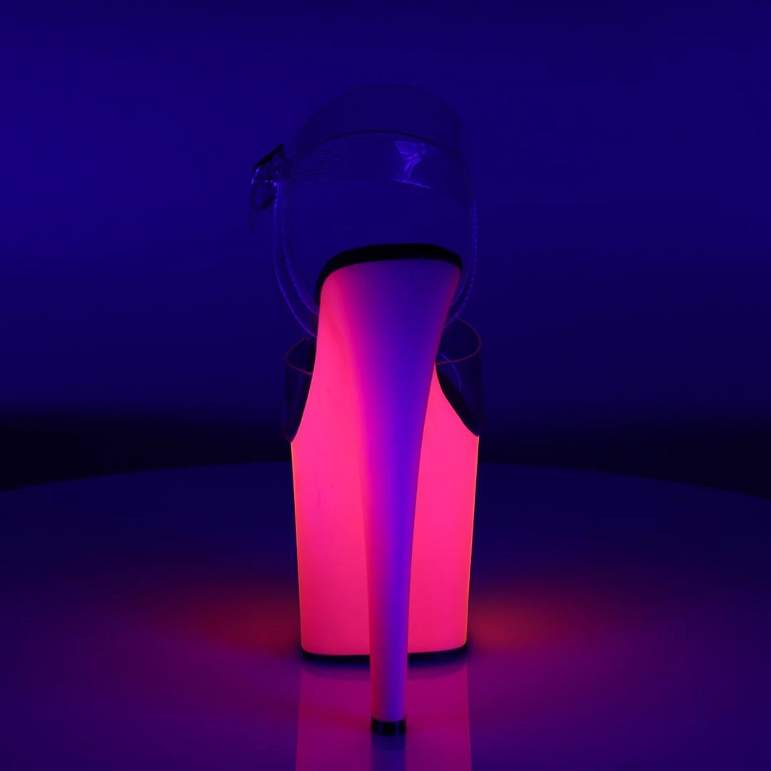 This Ankle Strap Sandal Featuring 7 1/2″ Heel, 3 1/2″ PF, Neon UV Reactive Multicolored Platform Bottom.