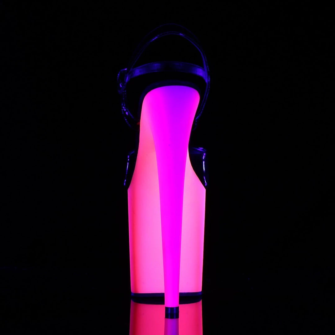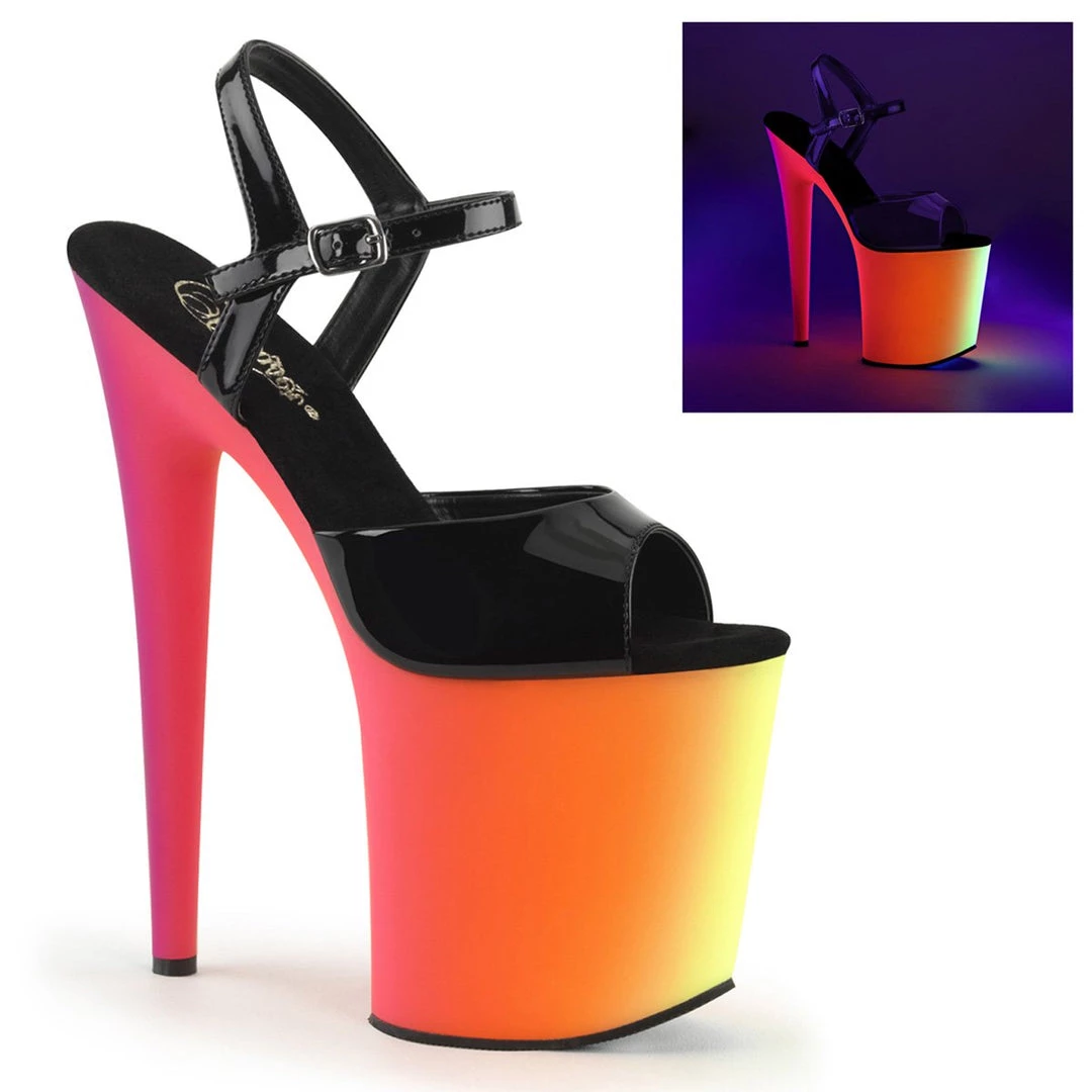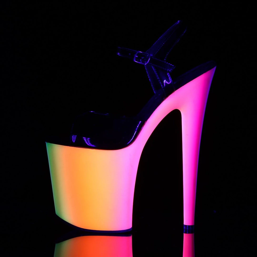 Ankle Strap Sandal Featuring Featuring Neon Black light Reactive Multicolored Platform Bottom with single strap in toe area, supportive ankle strap with adjustable length and metallic buckle on the exterior side and padded sole for extra comfort. The look is complemented by a 8 inch high stiletto heels and a 4 inch front platform.