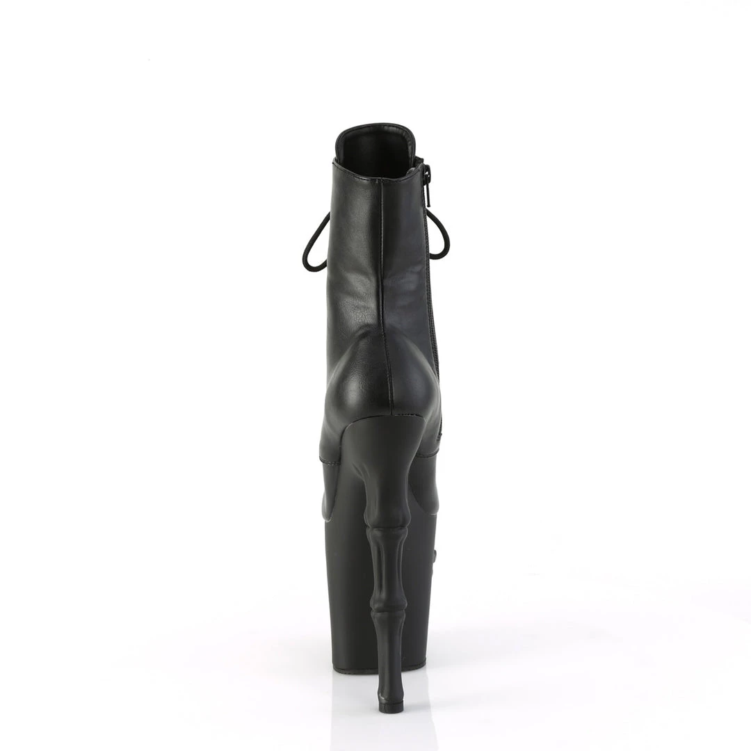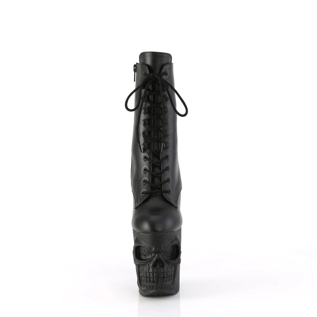 Mysterious goth! An 8″ (200mm) finger bone heel, 4″ (100mm) skull sculpted platform lace-up front ankle boot, inner side zip closure.