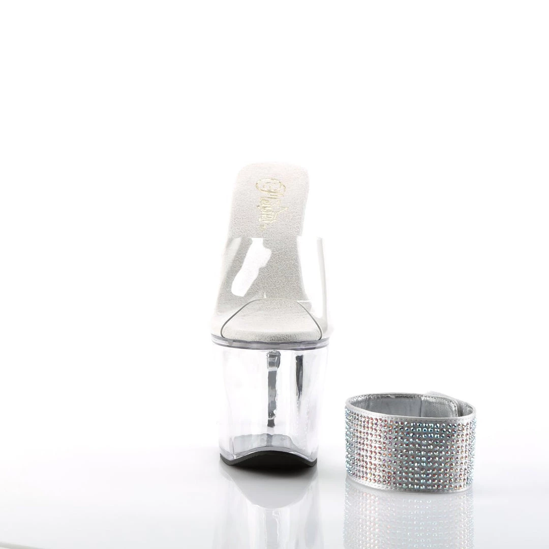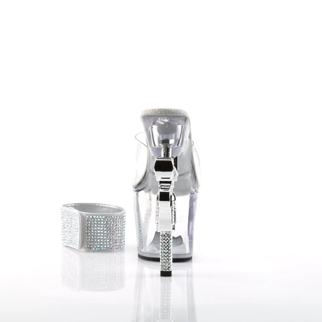 Rhinestones Embellished Ankle Cuff Sandal in military style of the brand Pleaser. Featuring Revolver Heel in metal optic with applicated rhinestones, an open toe and wide clear top strap. The dazzling 7 inch (17.5 cm) high heels preserve the same design and add extra sass to these chic mules. Original and extremely provocative, these shoes make a statement whenever worn.