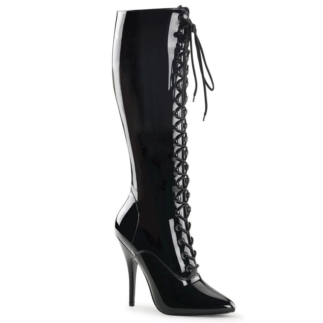 Knee-high boots, full size zip on the interior side for a comfortable put on and front lace-up closure for a perfect fit. The pointed toe thins the leg, while the front flat sole contrasts with the 5 inch (12.5 cm) high heels and creates a sexy foot arch that attracts all eyes. Sassy and seductive, these boots feature a chic design that will never go out of fashion.