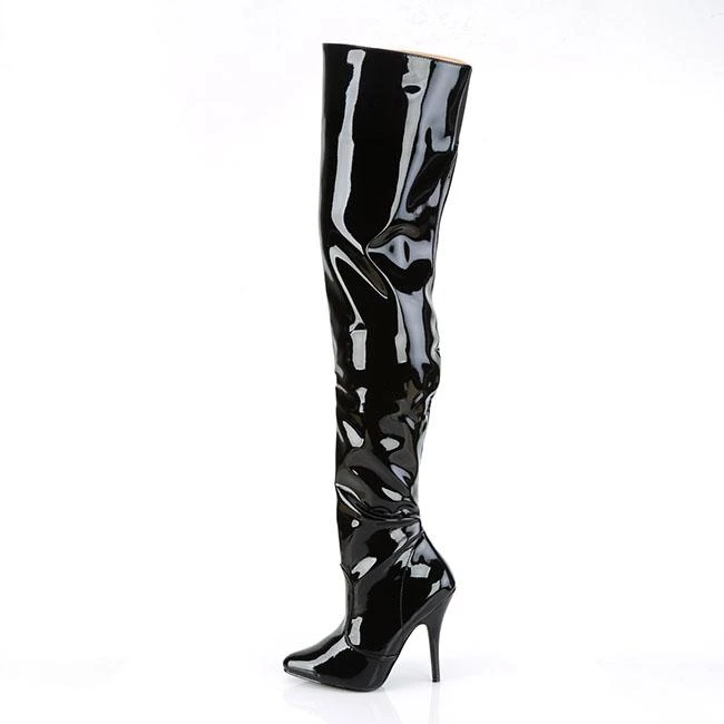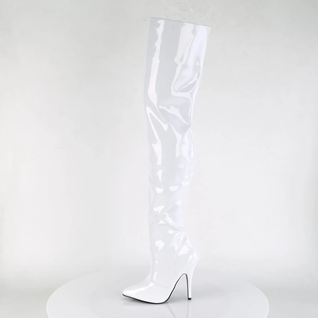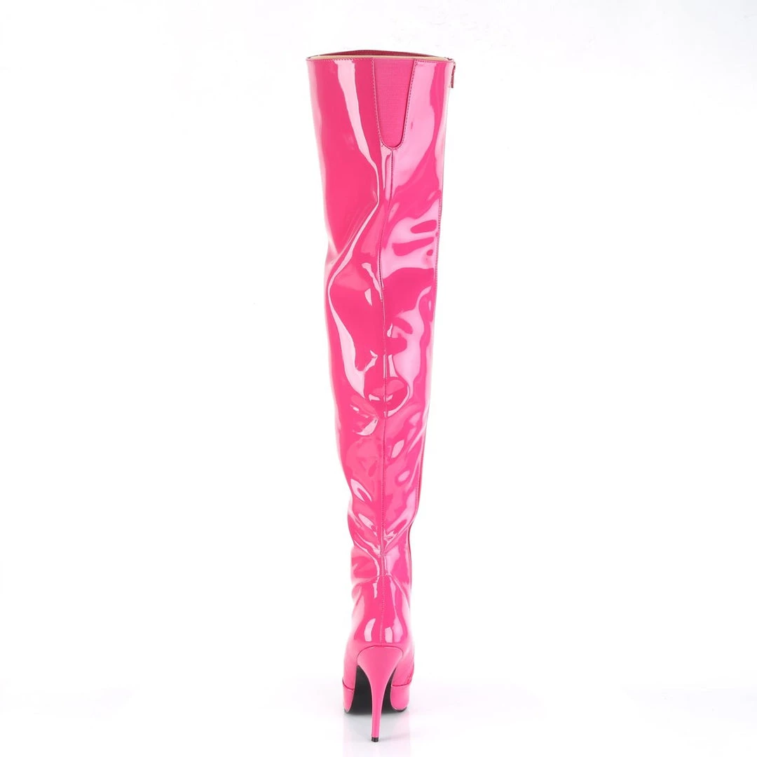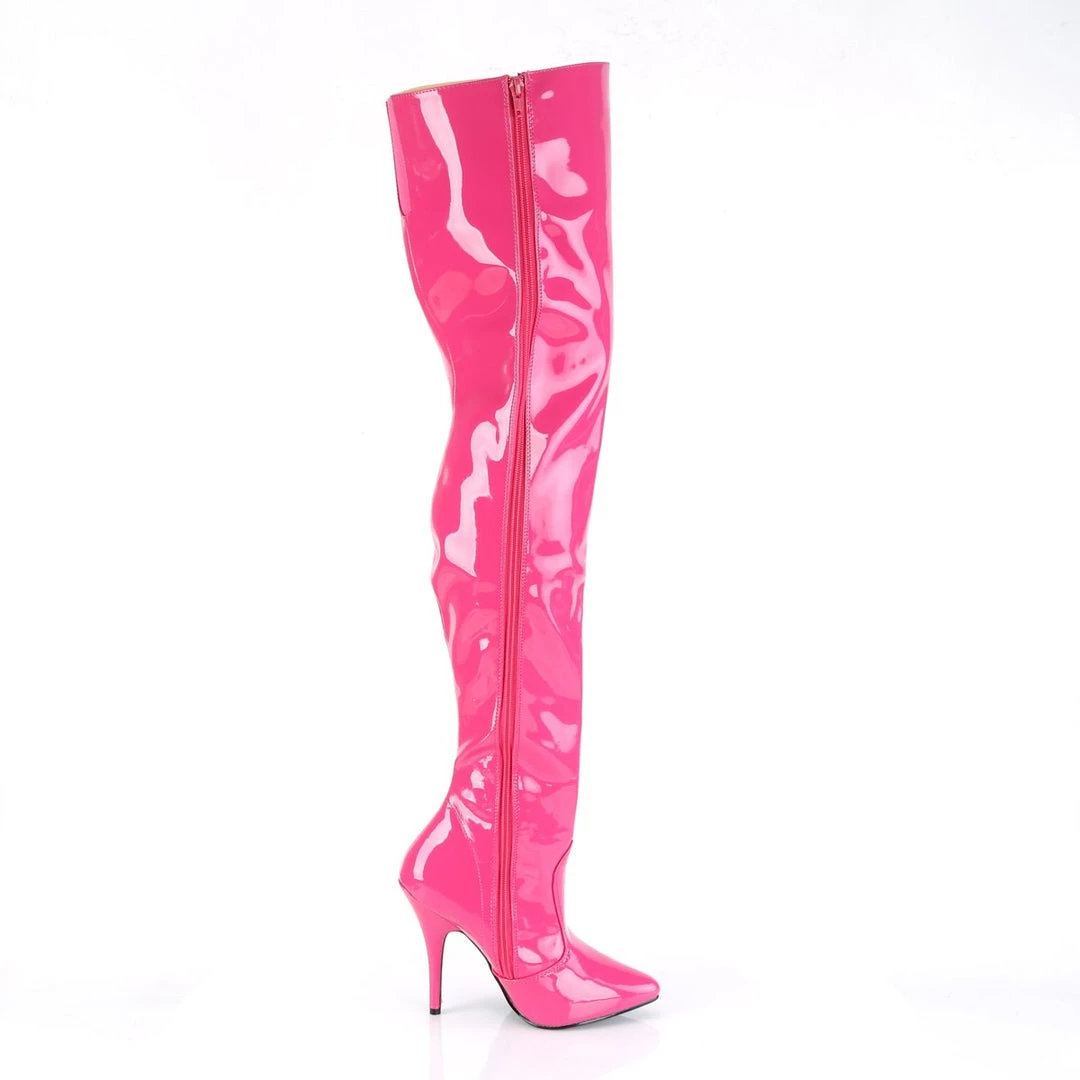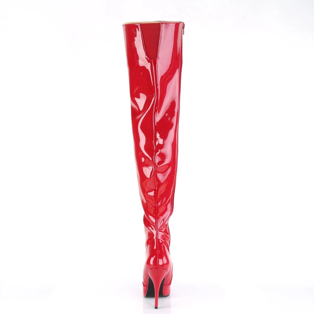 A patent boots with thigh-high length, inner zipper for an easy put on and front cut-and-sewn detail. The pointed toe balances the extra long top, while the 5 inch (12.5 cm) high heels with matching red colour add extra length to the legs for a wow appearance. Vibrant and provocative, these boots spice up your outfits for a stunning look.