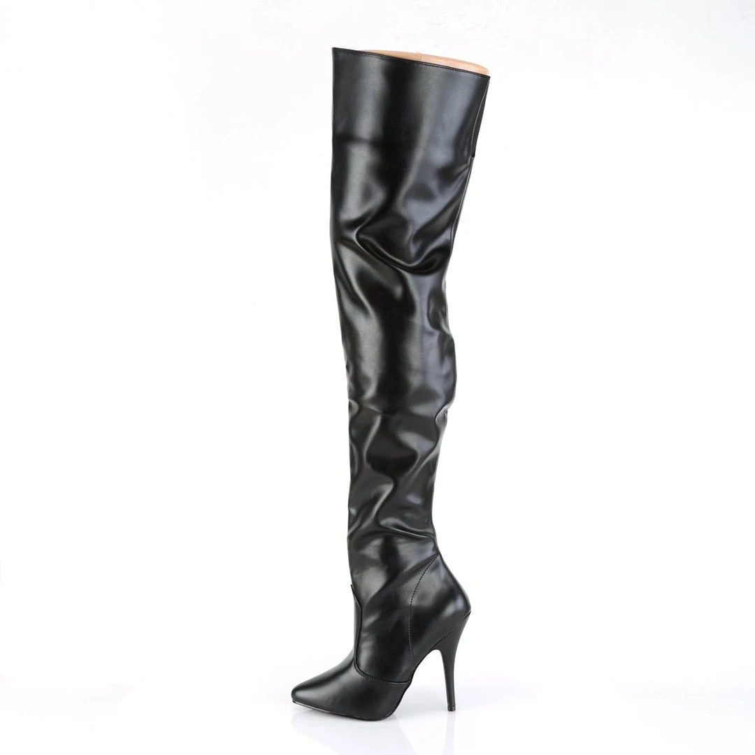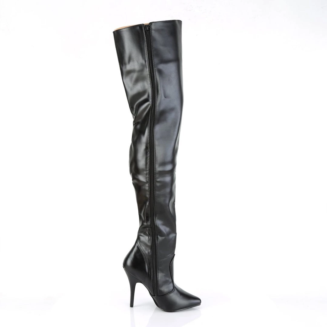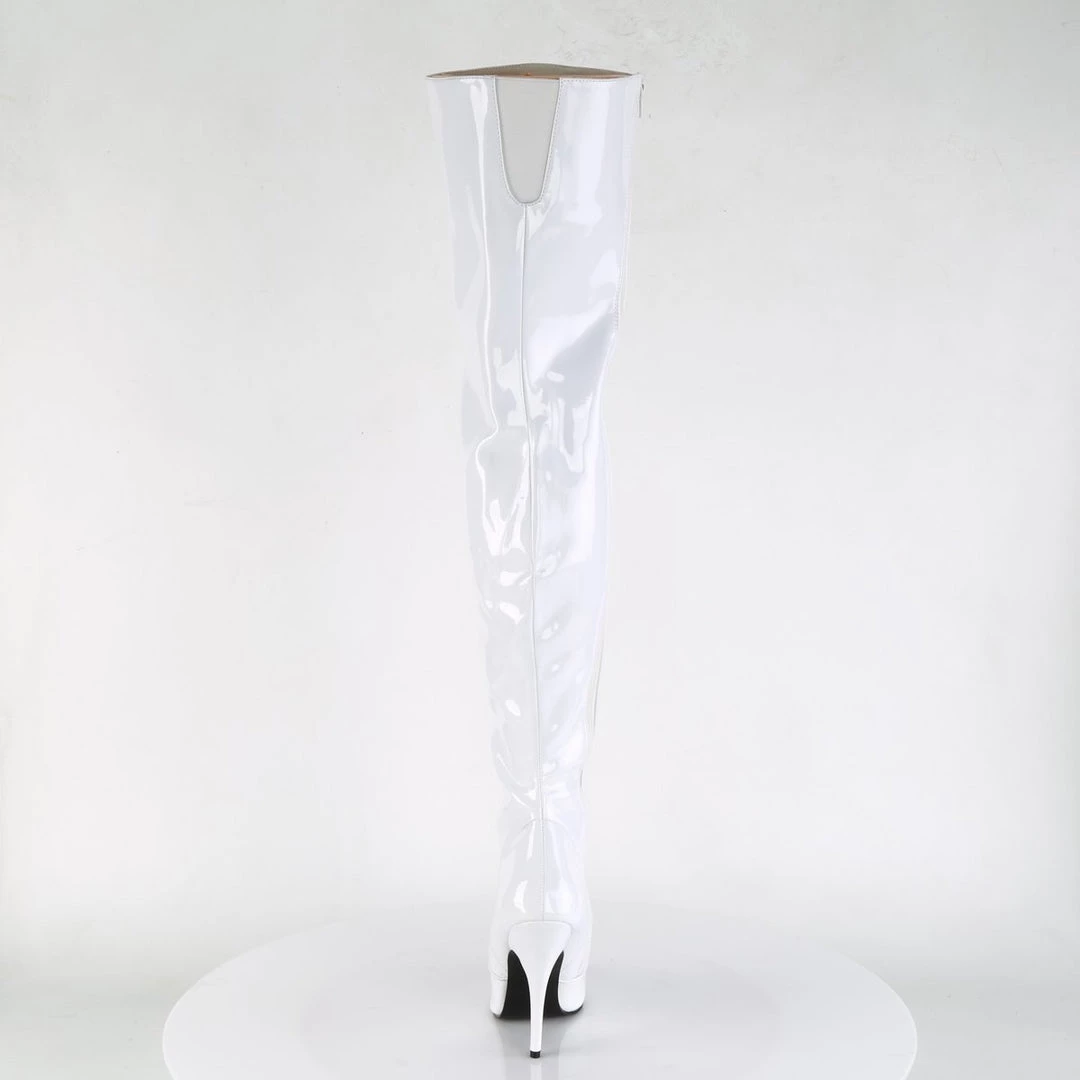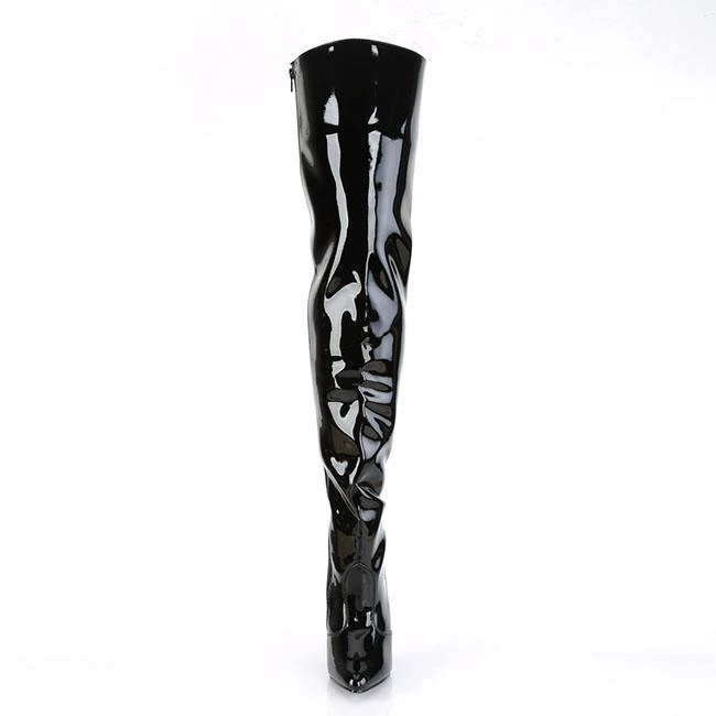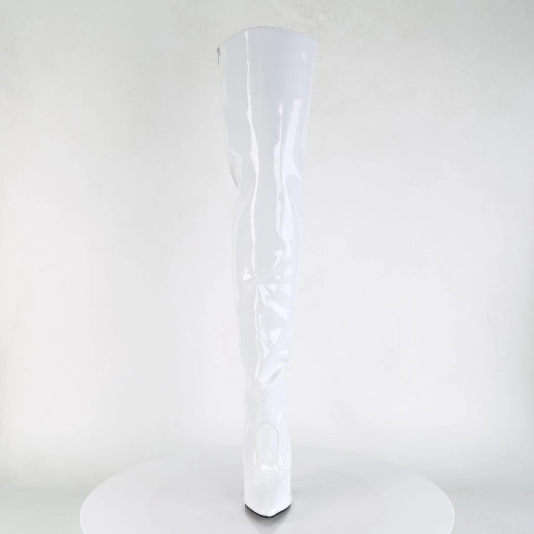 A patent boots with thigh-high length, inner zipper for an easy put on and front cut-and-sewn detail. The pointed toe balances the extra long top, while the 5 inch (12.5 cm) high heels with matching red colour add extra length to the legs for a wow appearance. Vibrant and provocative, these boots spice up your outfits for a stunning look.