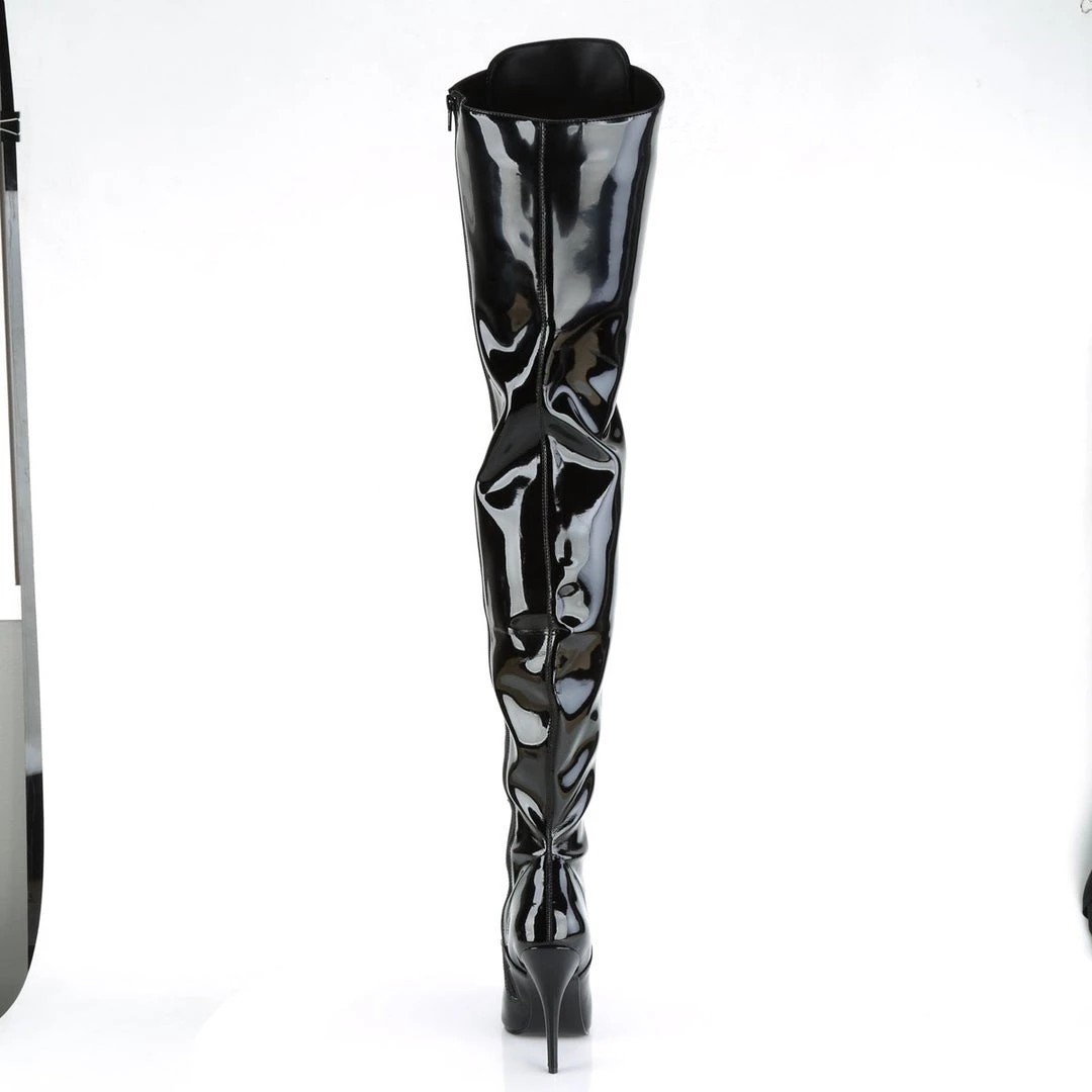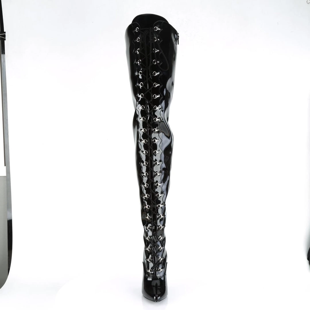 Super hot crotch-high boots in black patent with front tone-to-tone lace-up, supporting D-rings and waving trim on each side of the lace-up. A full-size zip closure positioned on the inner side enables a comfortable put on, white the 5 inch (12.5 cm) high heels add extra length to the legs for a sultry look.