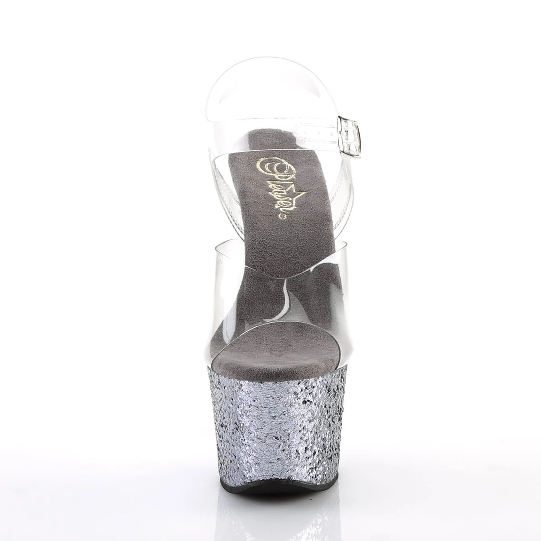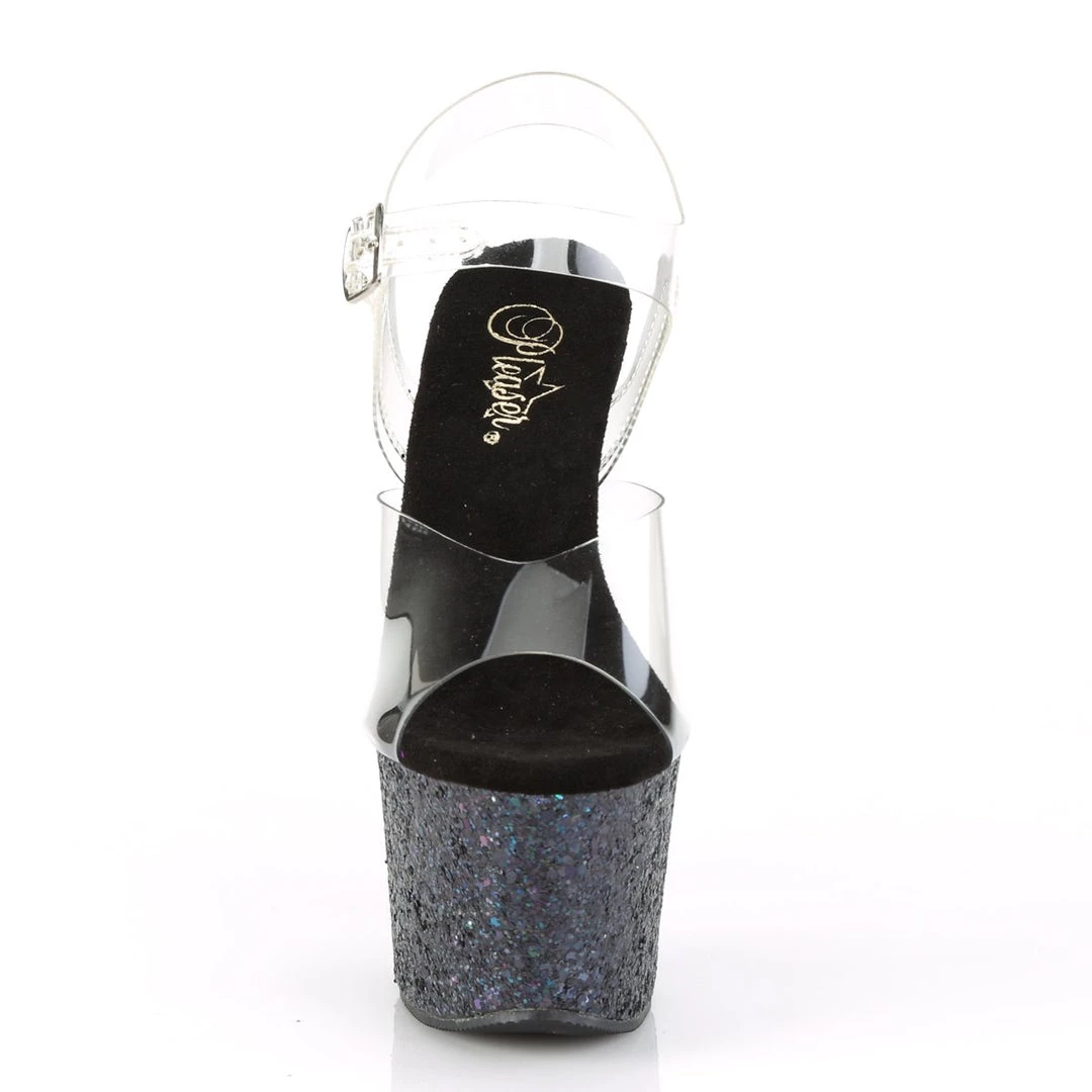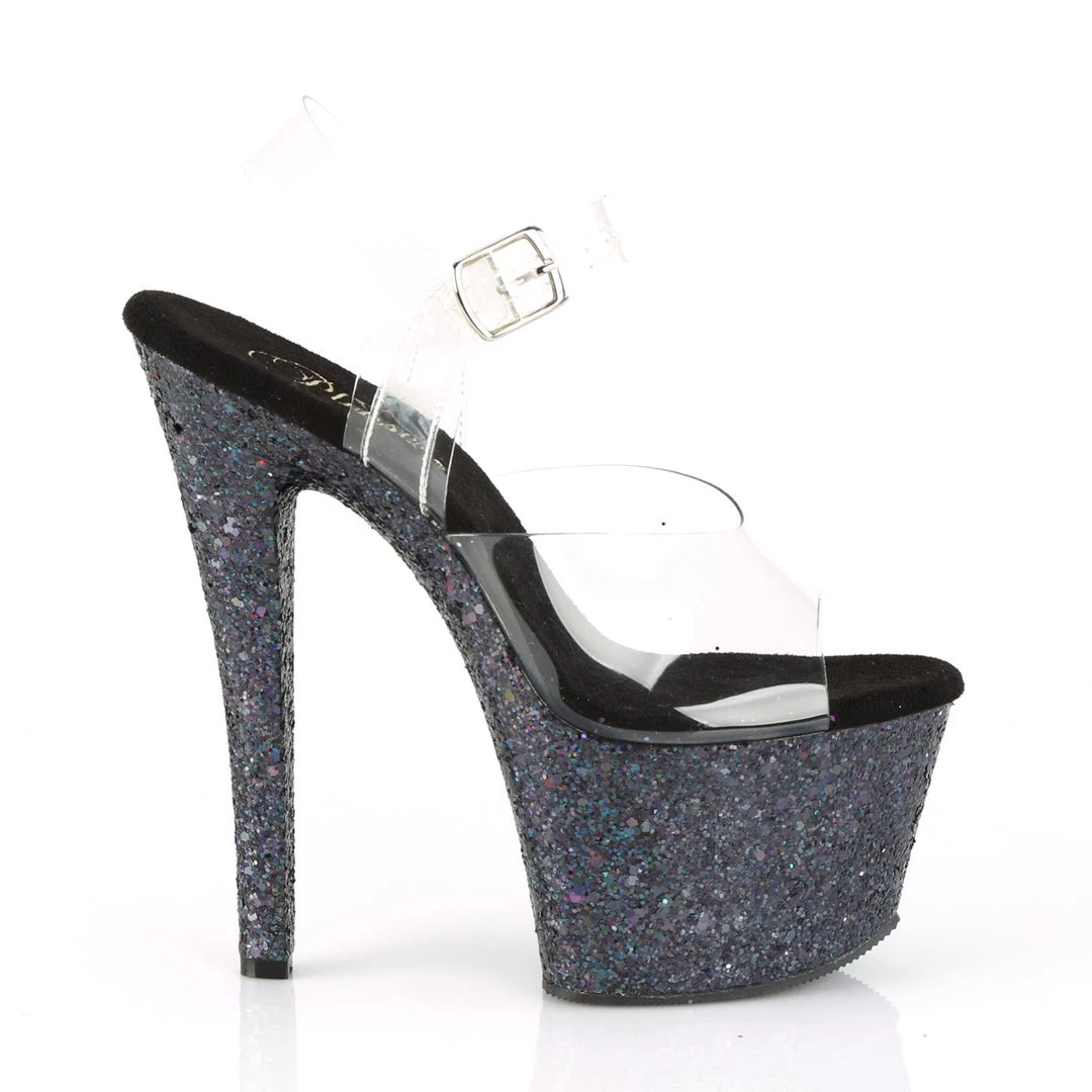 Gorgeous 7″ (178mm) heel, 2 3/4″ (70mm) platforms featuring holographic glitters on the entire platform bottom. These are sure to turn a few heads!