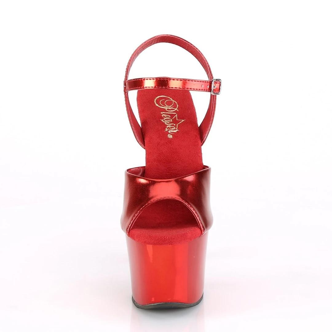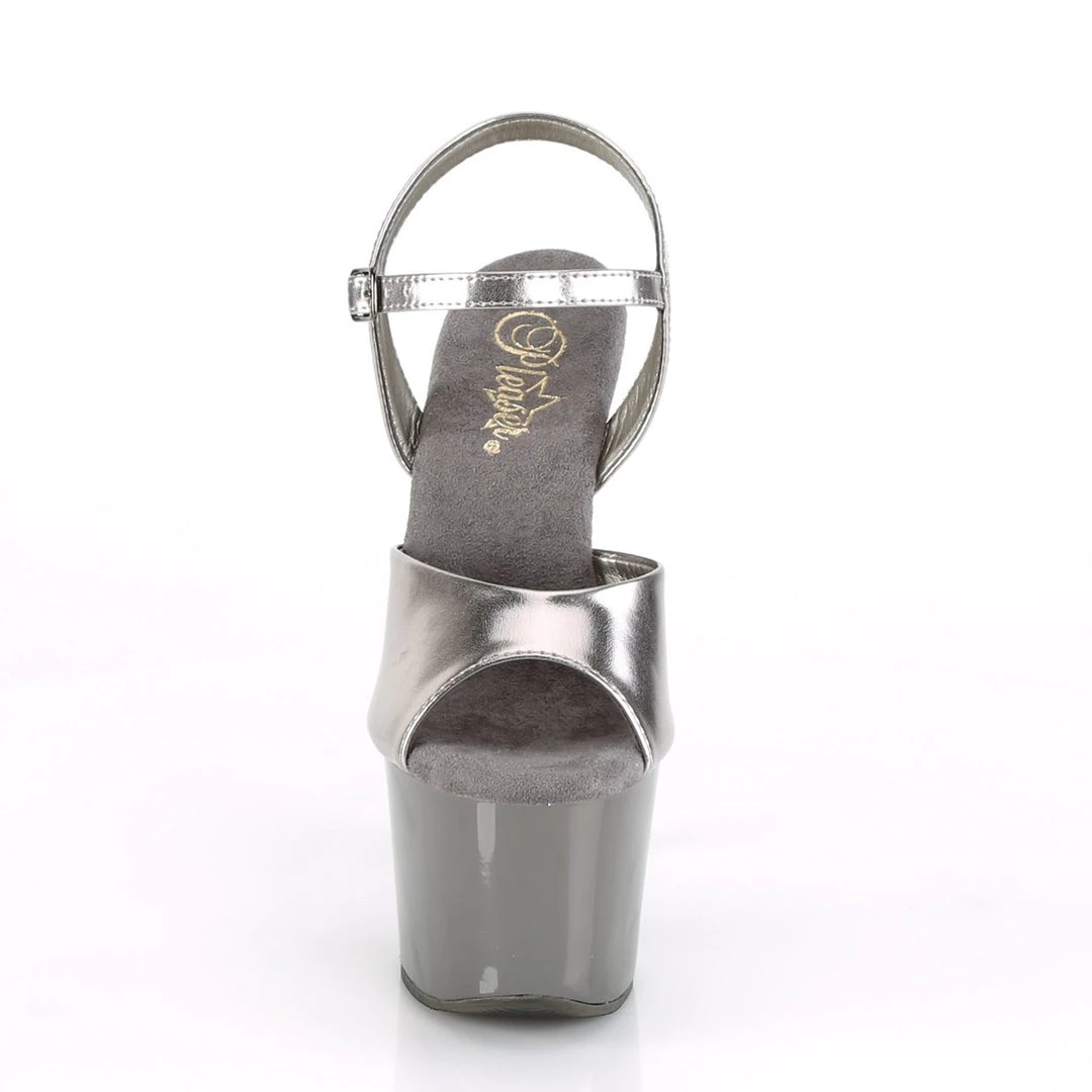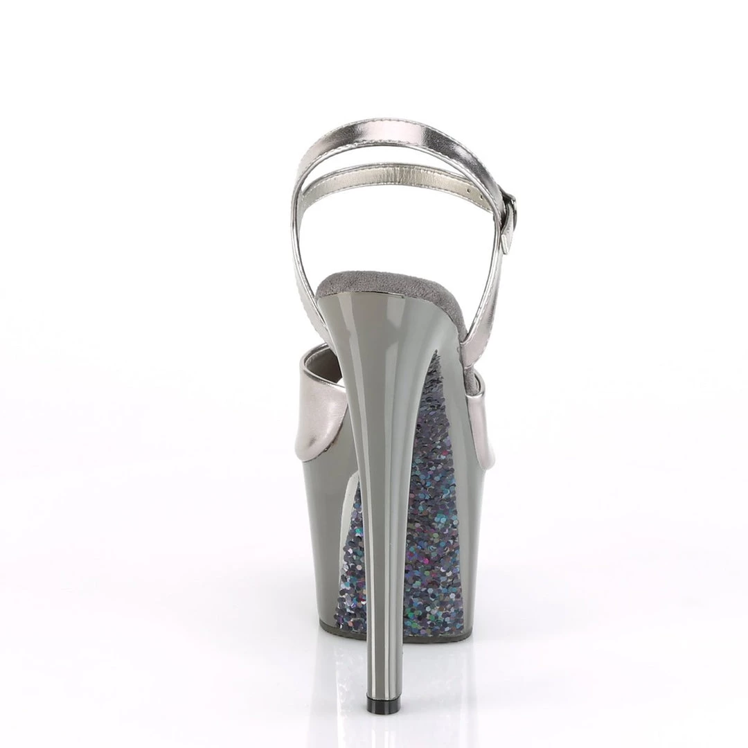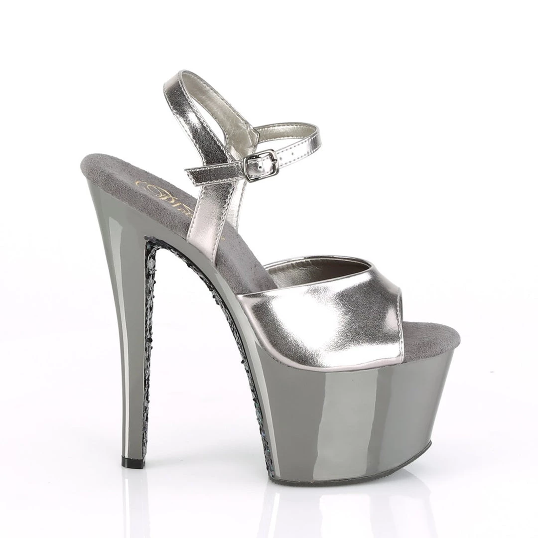 Show them who’s boss with these 7″ (178mm) heel, 2 3/4″ (70mm) platform two tone ankle strap sandals. These stunning shoes feature glitters covering the entire platform bottom.