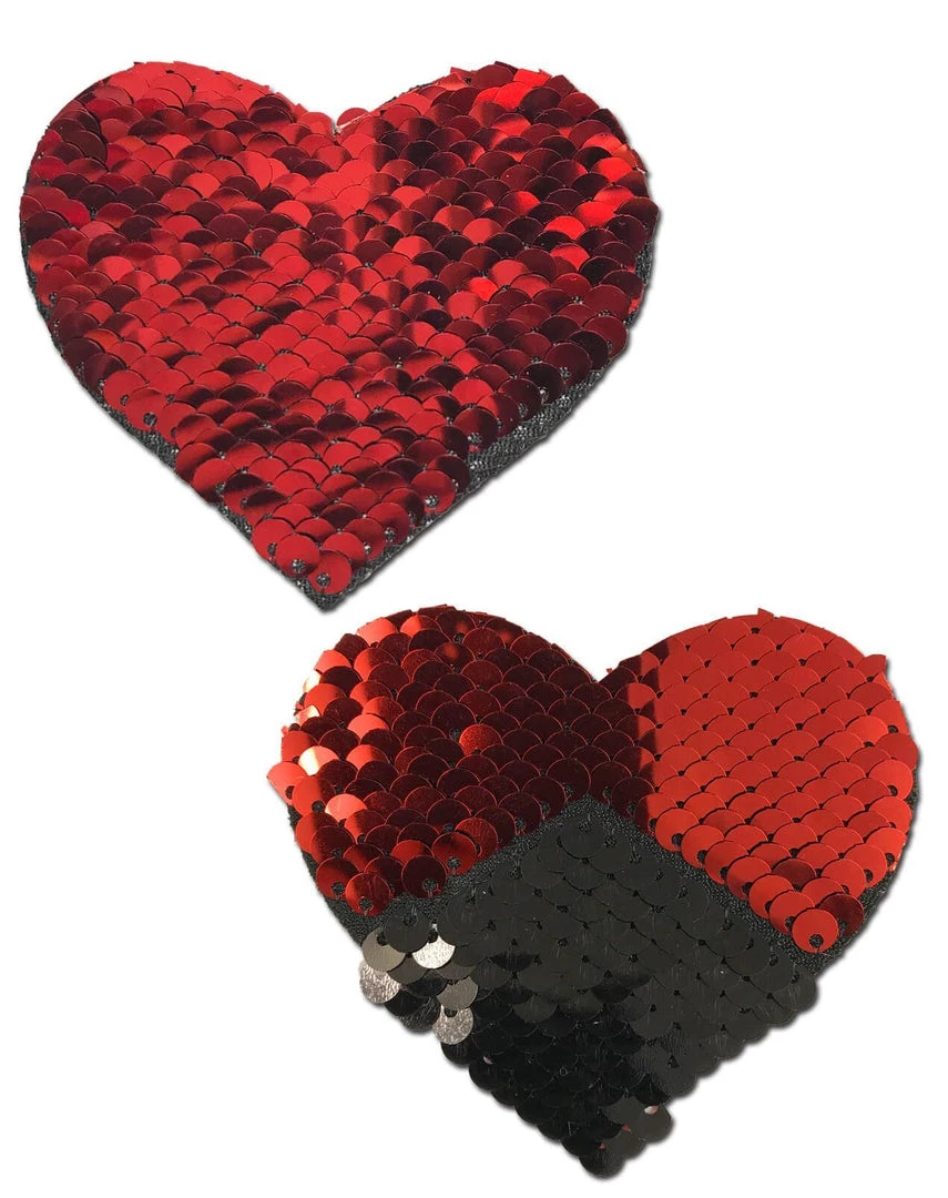Red & Black Color Changing Sequin Heart Nipple Pasties by Pastease® are hand-made in the USA of reversible sequin material that forms to curves and resists wrinkling over hardening nipples.