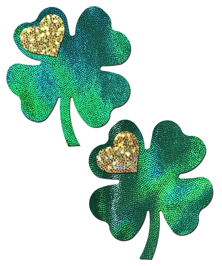 Holographic Green Shamrocks with Hearts o’ Gold Nipple Pasties by Pastease® are hand-made in the USA of soft form-fitting holographic material that forms seamlessly to curves and resists wrinkling over hardening nipples.