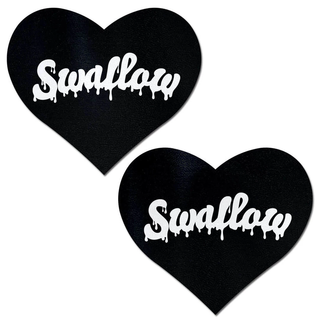 Pastease Love: “Swallow” In White On Black Heart Nipple Pasties