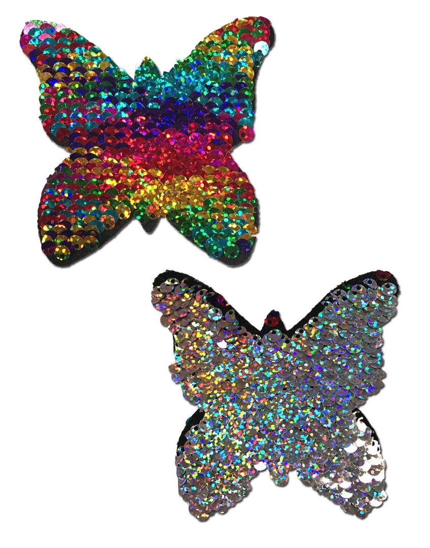 Monarch: Rainbow & Silver Glitter Color Changing Sequin Nipple Pasties by Pastease® are hand-made in the USA of reversible sequin material that forms to curves and resists wrinkling over hardening nipples.