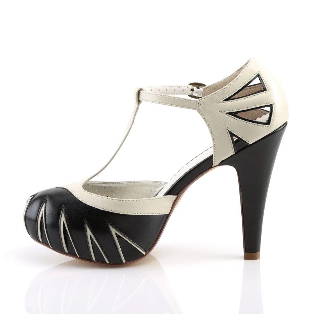 Gorgeous vintage style 4 1/2″ (11.4cm) heel, 1″ (2.5cm) hidden PF with two tone cut out T-Strap pumps