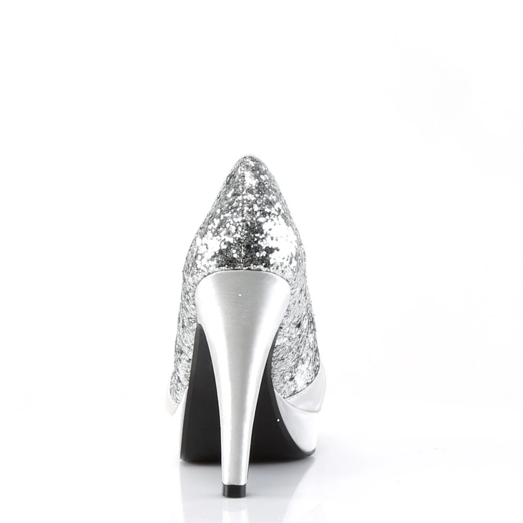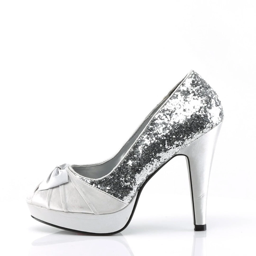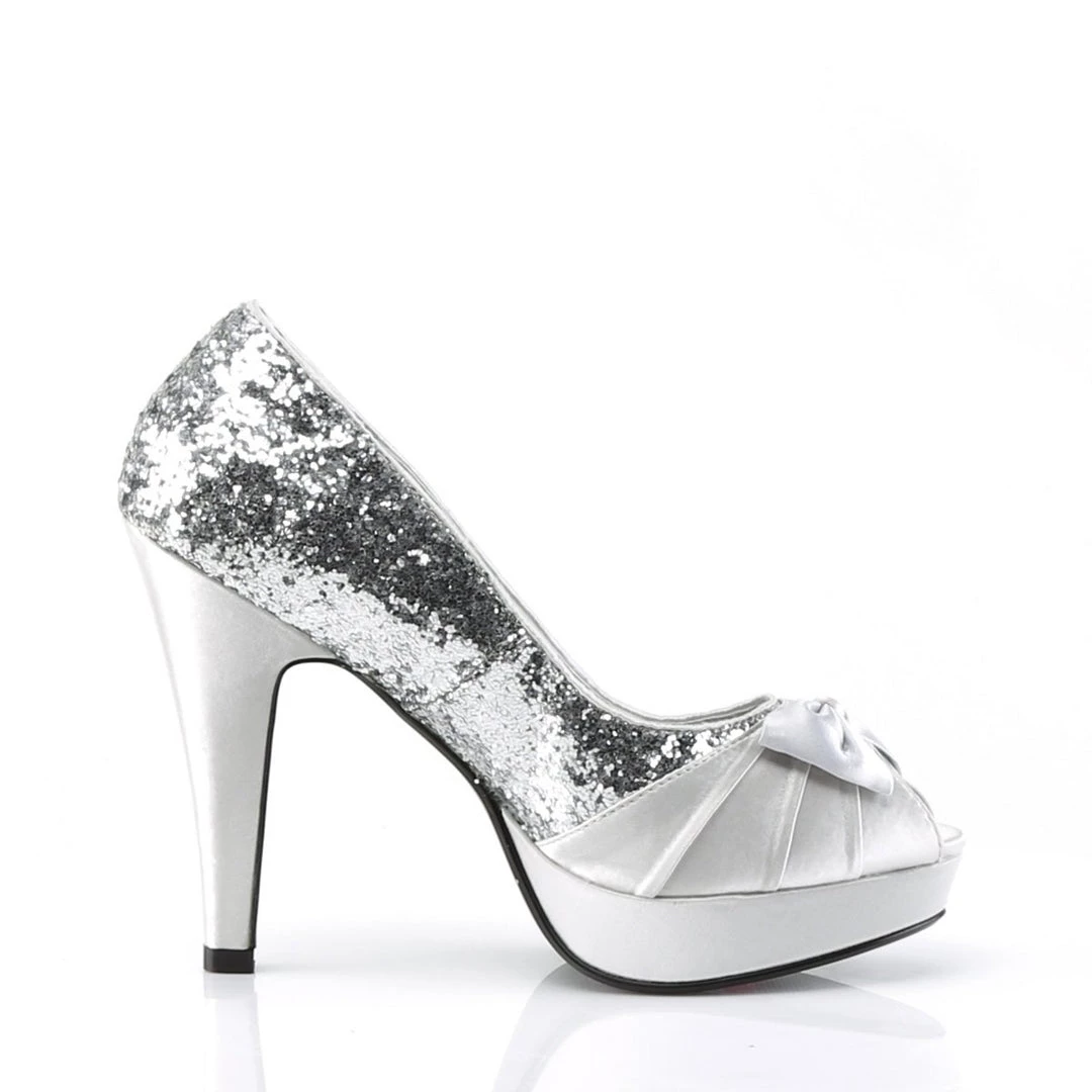 This classic silhouette with a pleated vamp gets vintage appeal from a peep-toe and timeless lines. Glitter and the bow at the toe lend sweet touches to this sassy stunner from Pleaser. Satin glitter heels to add glam to your outfit. Has a heel height of 4.5 inches.