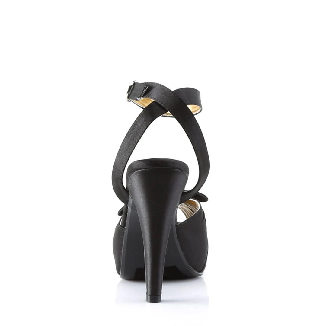 Show off your impeccable style with these fabulous heels from Pin Up Couture! Perfect shoe for any occasion! This shoe is made of satin and features a 4 1/4 inch heel, 1 platform, wrap around ankle strap and peep toe with top bow detail.