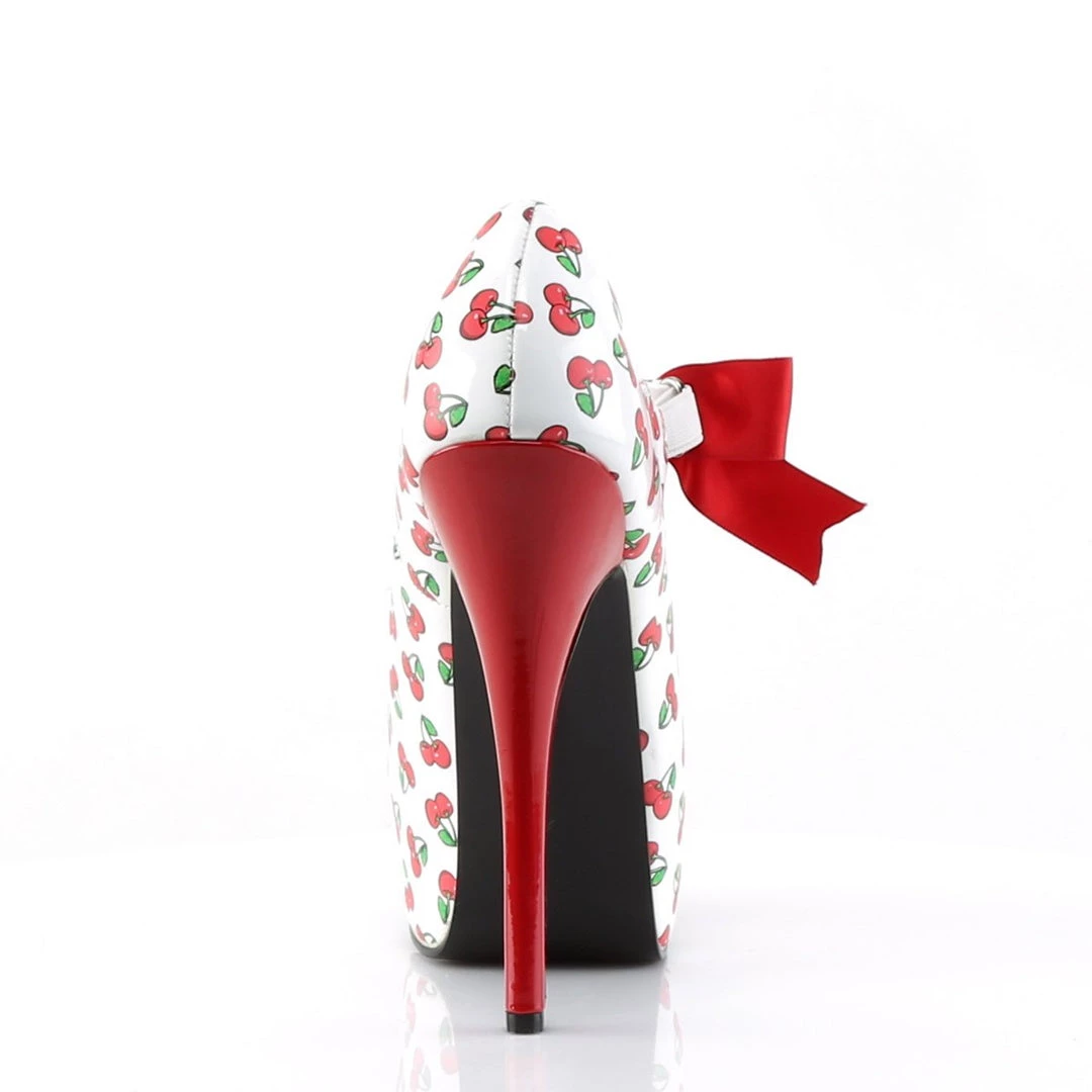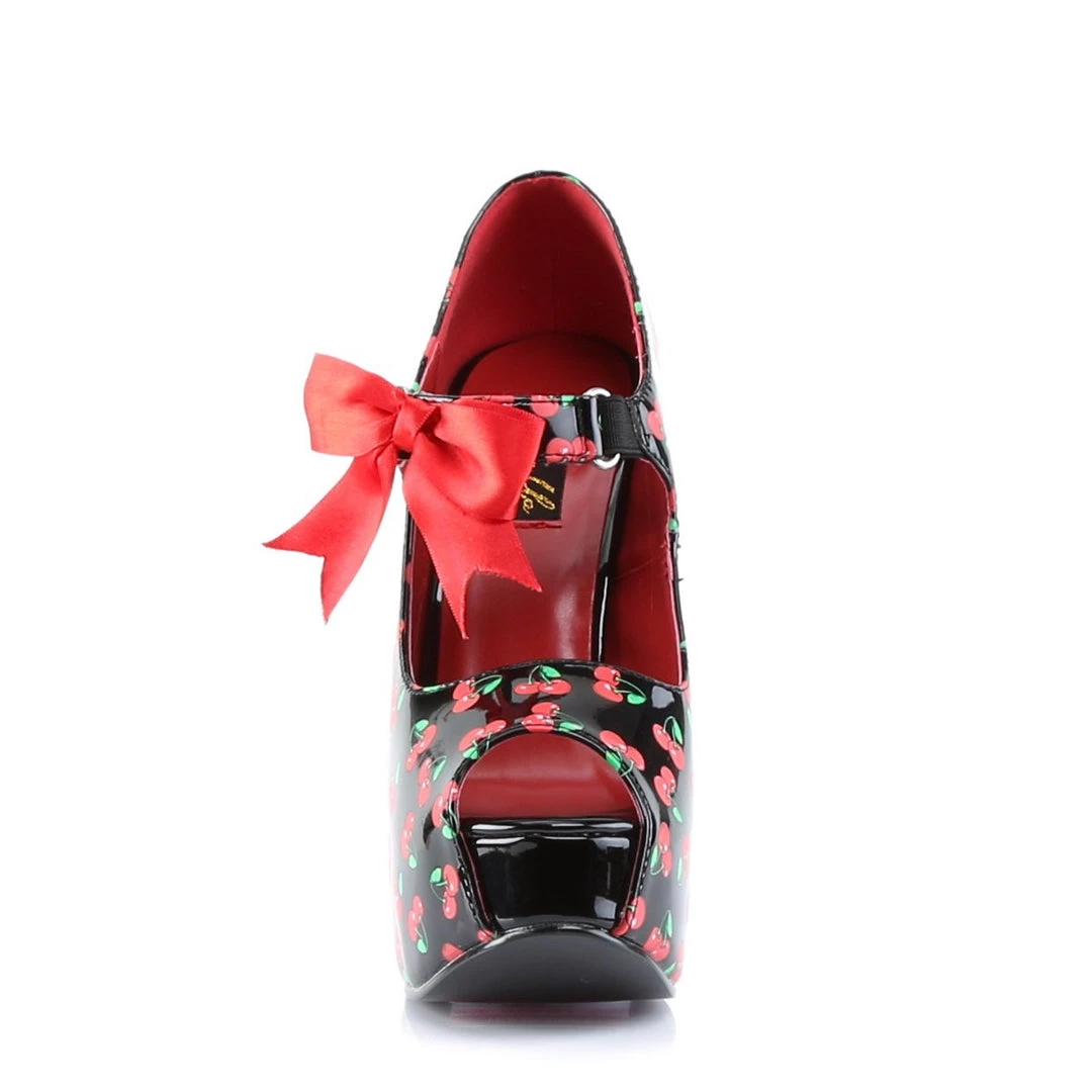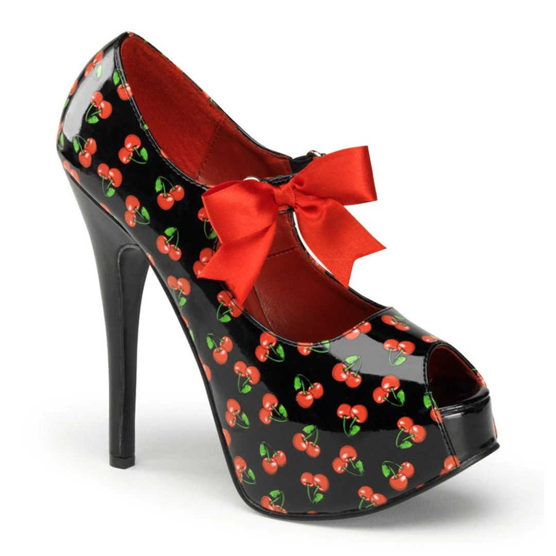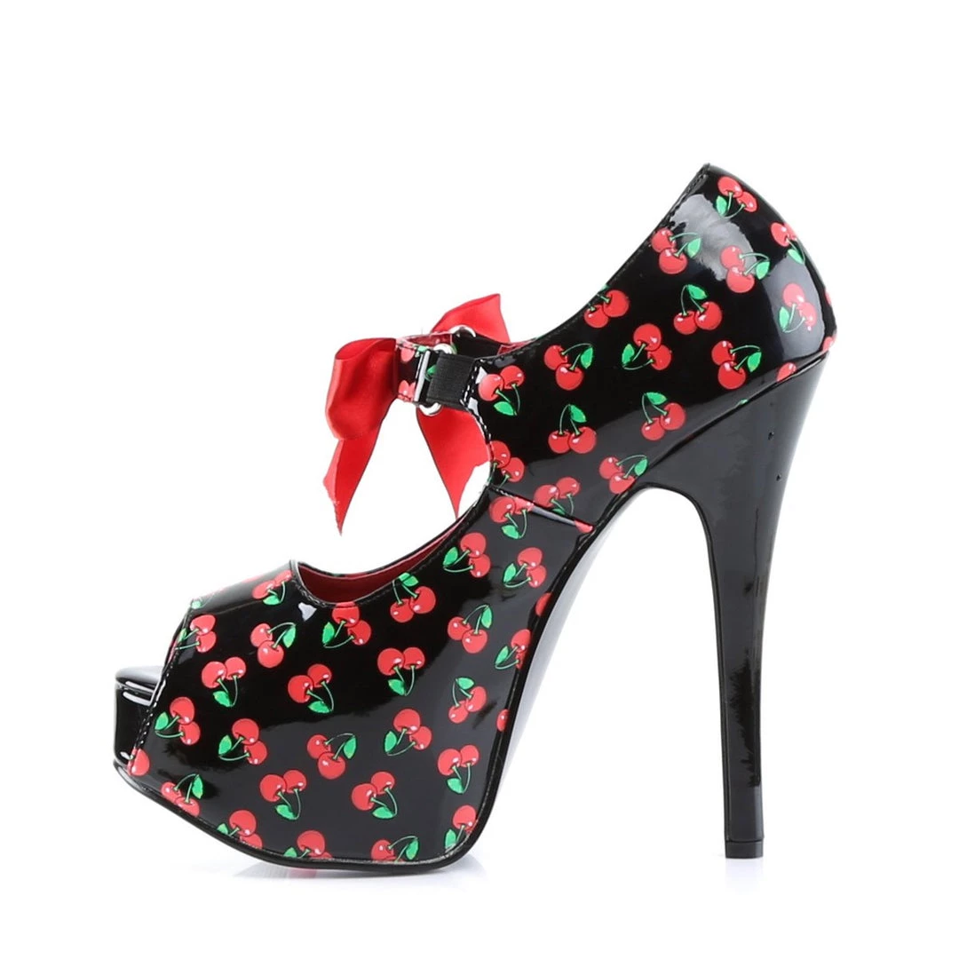 Open toe pumps with all-over Cherry print. These have a satin ribbon, high heel, and concealed platform. These Teeze heels give you great height, and add a stylish,fun touch to any ensemble.