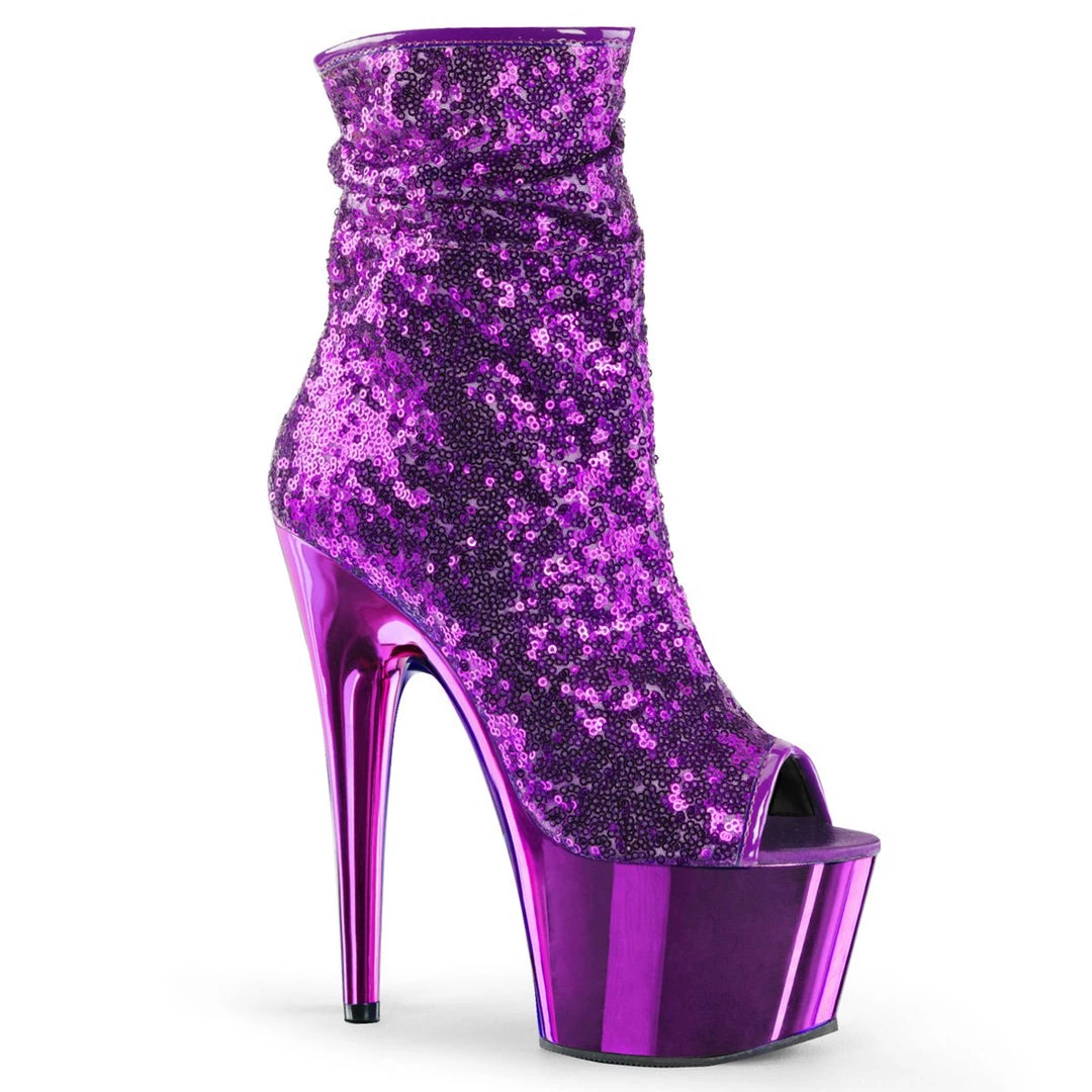 7 (17.75cm) heel, 2 3/4 (7cm) platform peep toe ruched shaft ankle boot, inside zip closure.