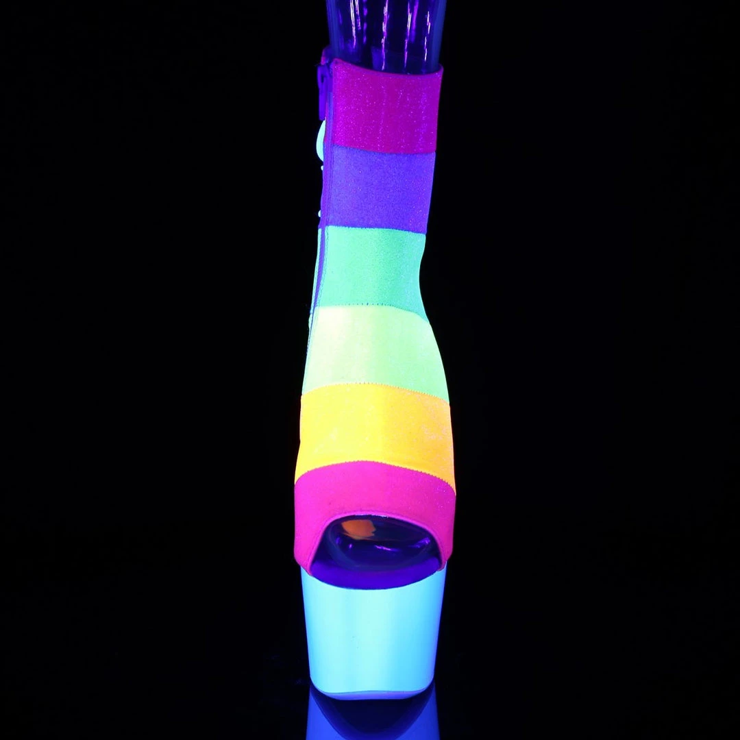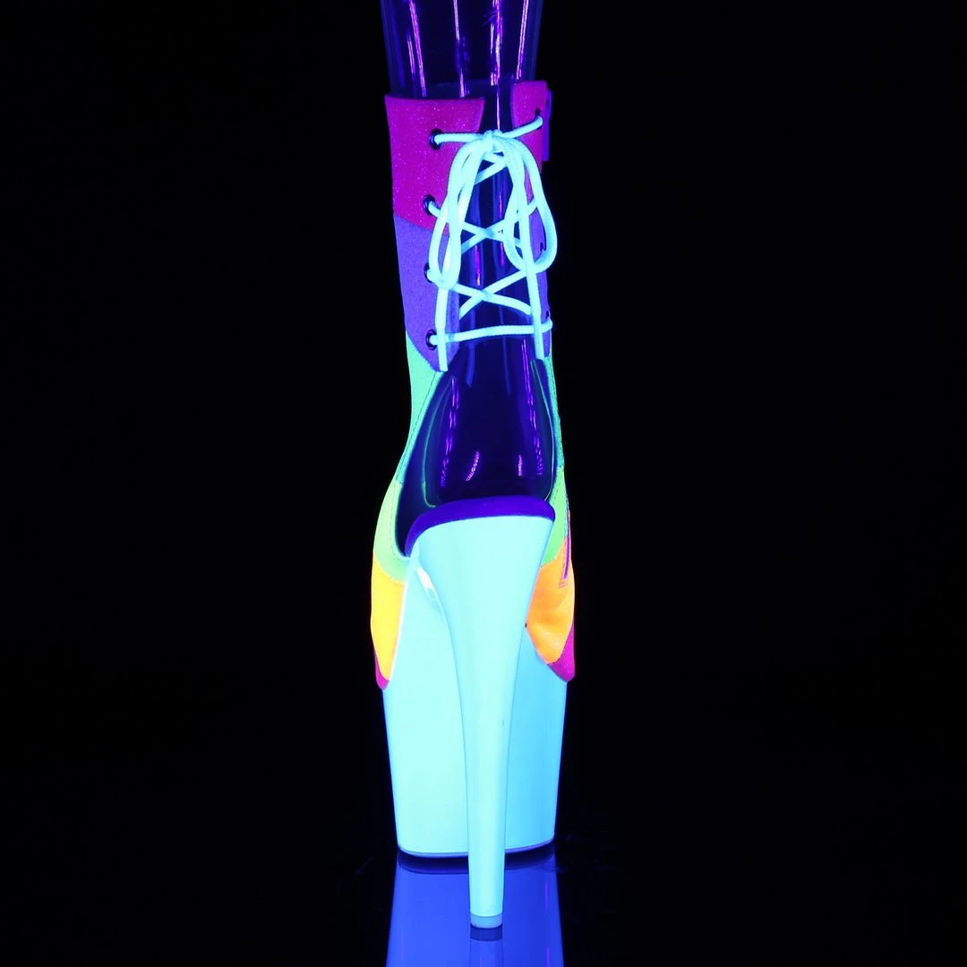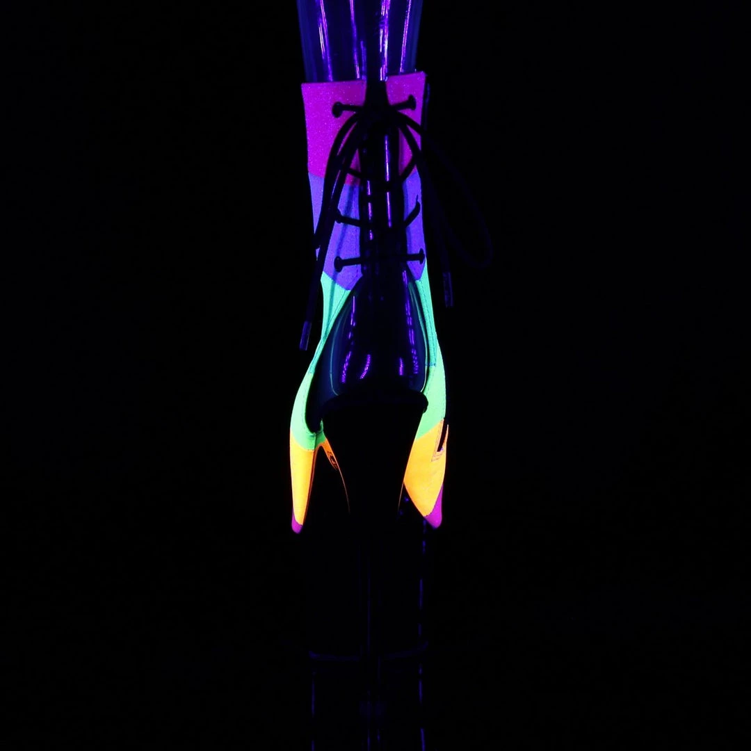 Sparkle in these fun & flirty 7″ (178mm) heel, 2 3/4″ (70mm) platform open toe/heel back lace-up ankle boot featuring blacklight reactive rainbow effect upper, full inside zip closure.