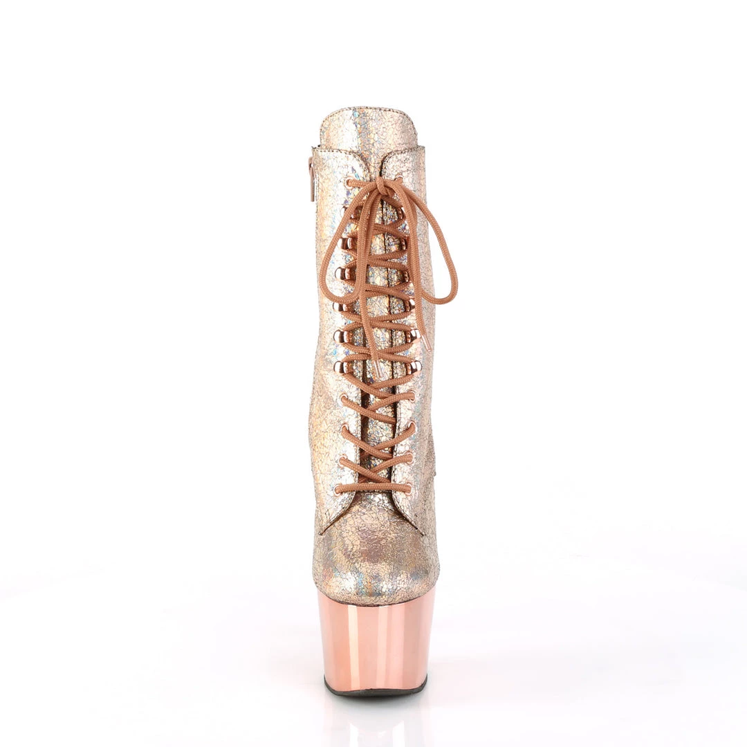 You don’t need approval you need a new pair of glittering platform heels! A 7″ (178mm) heel, 2 3/4″ (70mm) platform lace-up front ankle boot featuring wrinkled metallic upper and chrome-plated platform bottom, inner side zip closure.