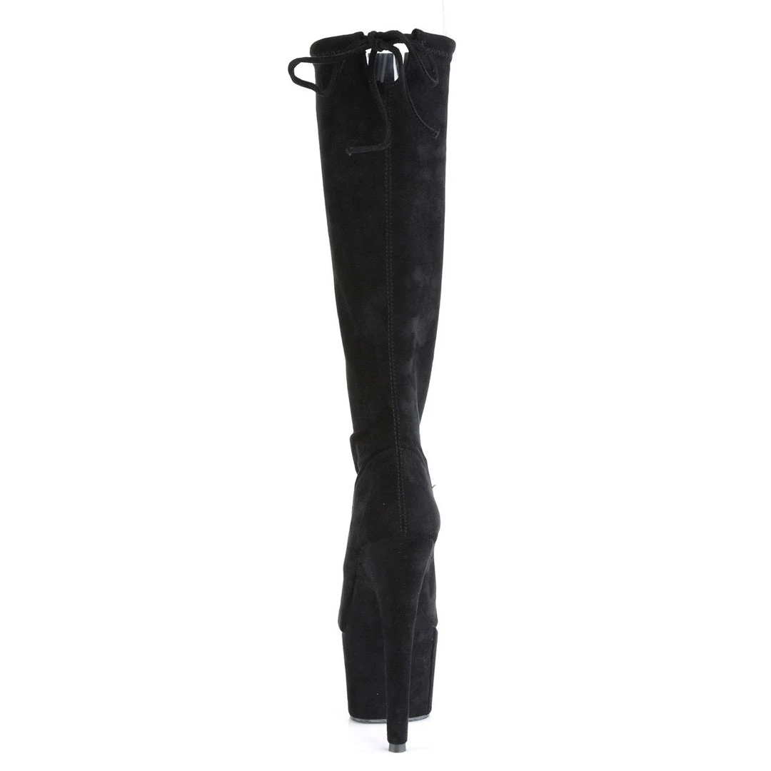 Sleek 7″ (178mm) heel, 2 3/4″ (70mm) platform stretch pull-on knee boot with back topline lacing featuring fully wrapped platform bottom.