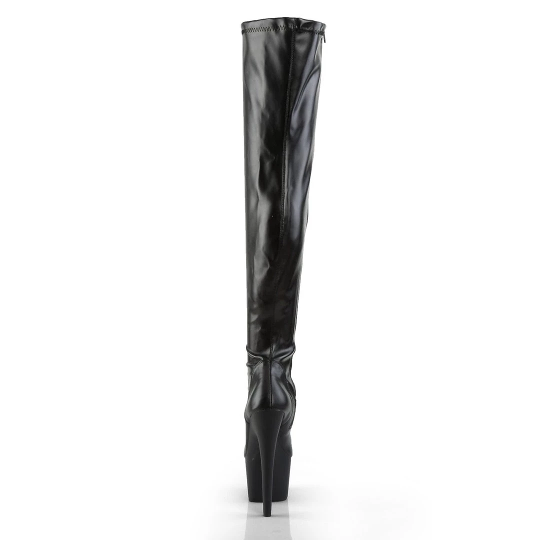 Stunning thigh-high boots in man-made leather with a matte texture, fitted design which flatters the legs and inner zip closure for an effortless put on. The daring 7 inch (17.5 cm) high stiletto heels are complemented by a high front platform with matching texture for an uniform look and a comfortable wear for long periods.