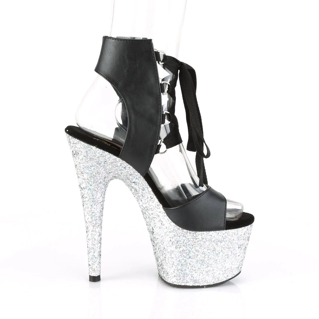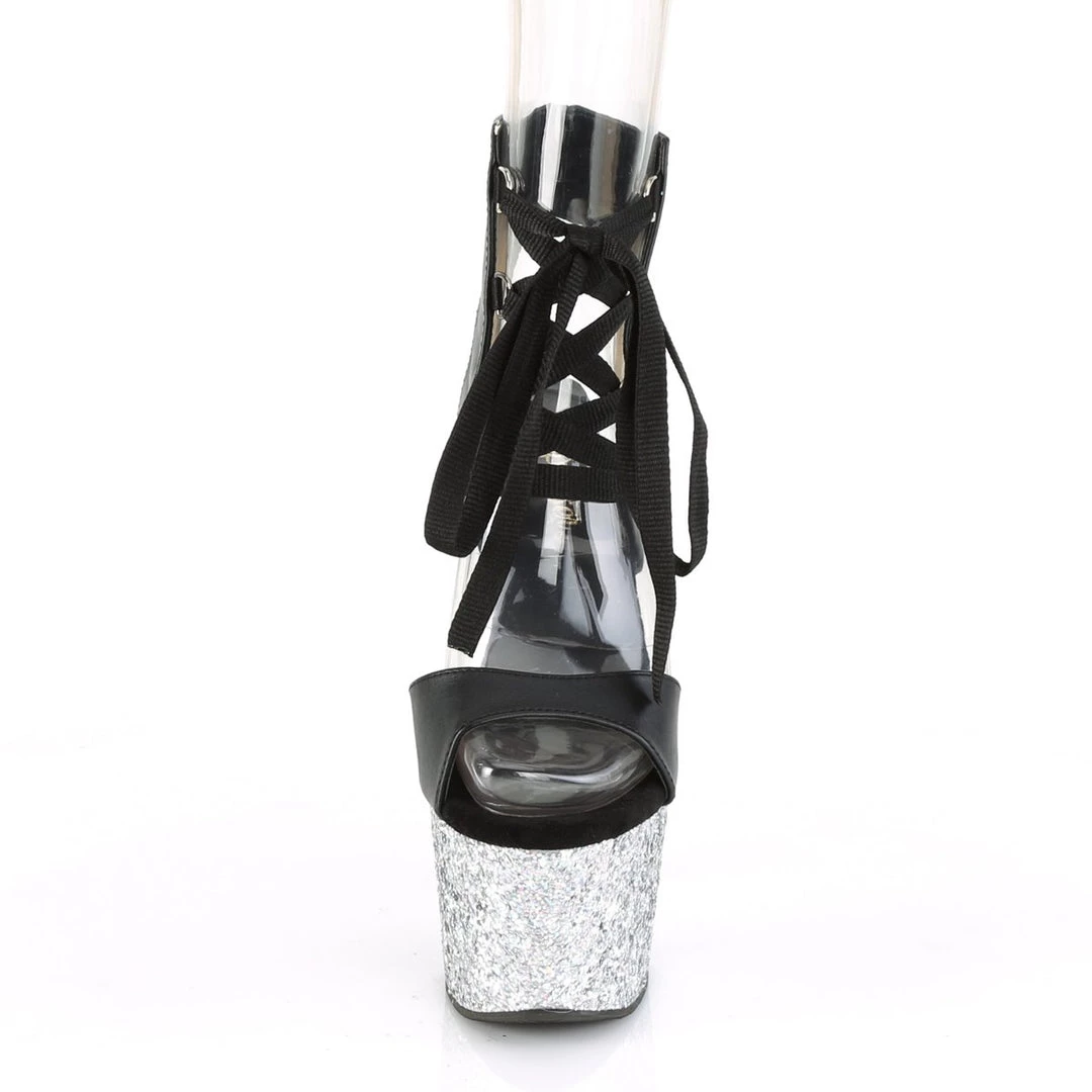 Sleek & sexy 7″ (178mm) heel, 2 3/4″ (70mm) platform front lace-up ankle high sandal.