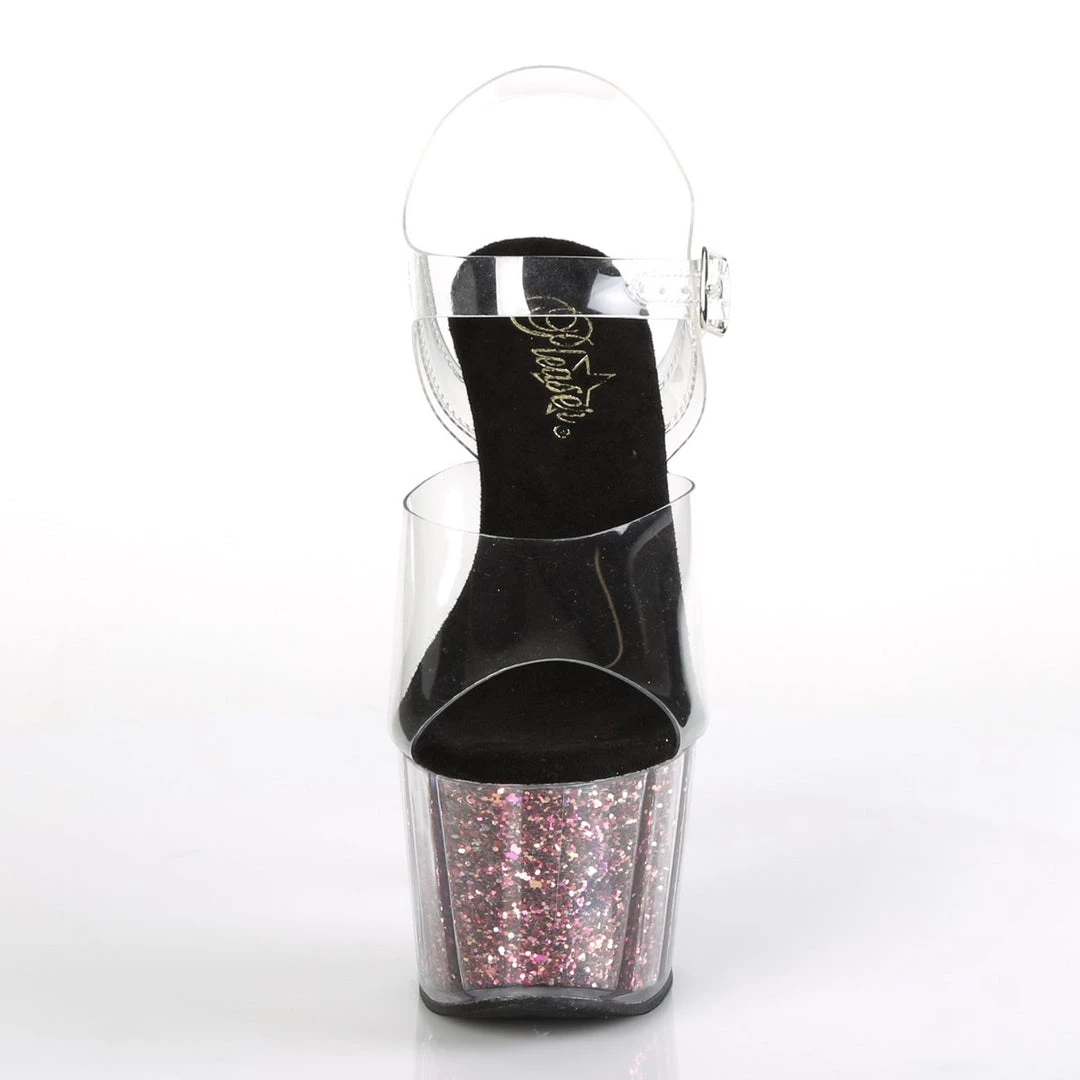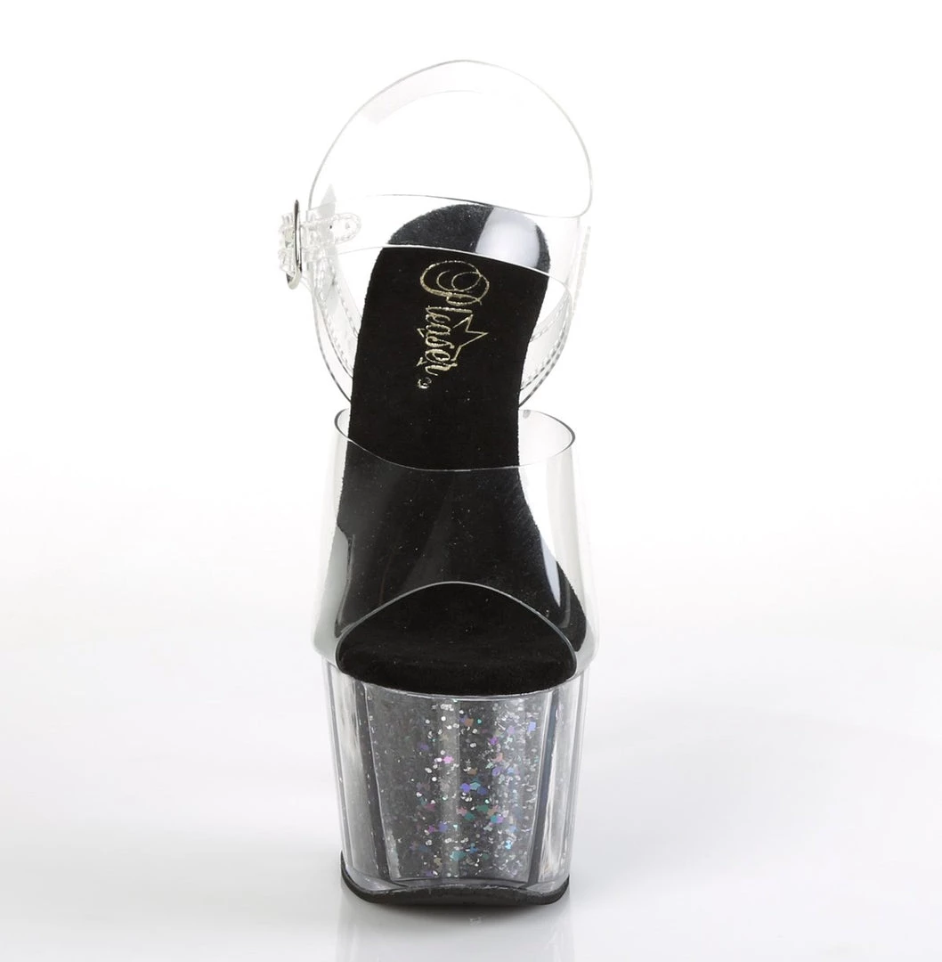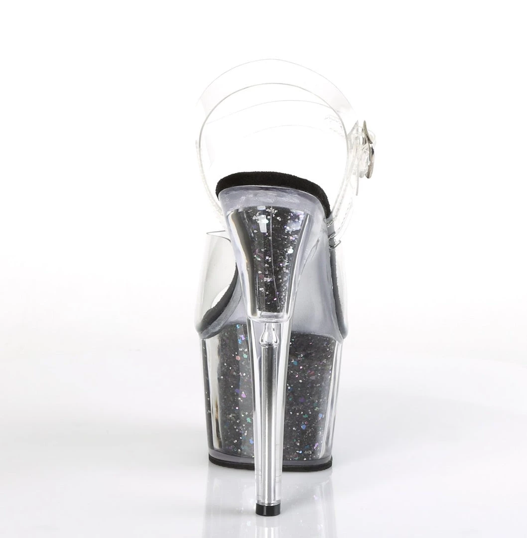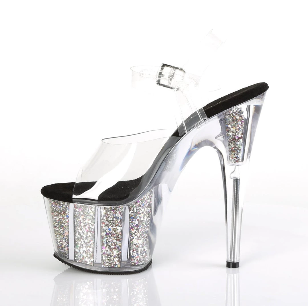 Show off those sexy legs with a little help from these gorgeous 7″ (178mm) heel, 2 3/4″ (70mm) platform ankle strap sandals with confetti glitter inserts in the platform bottom.