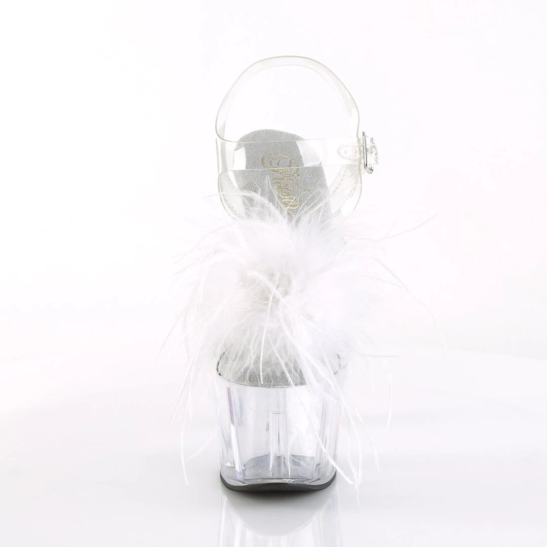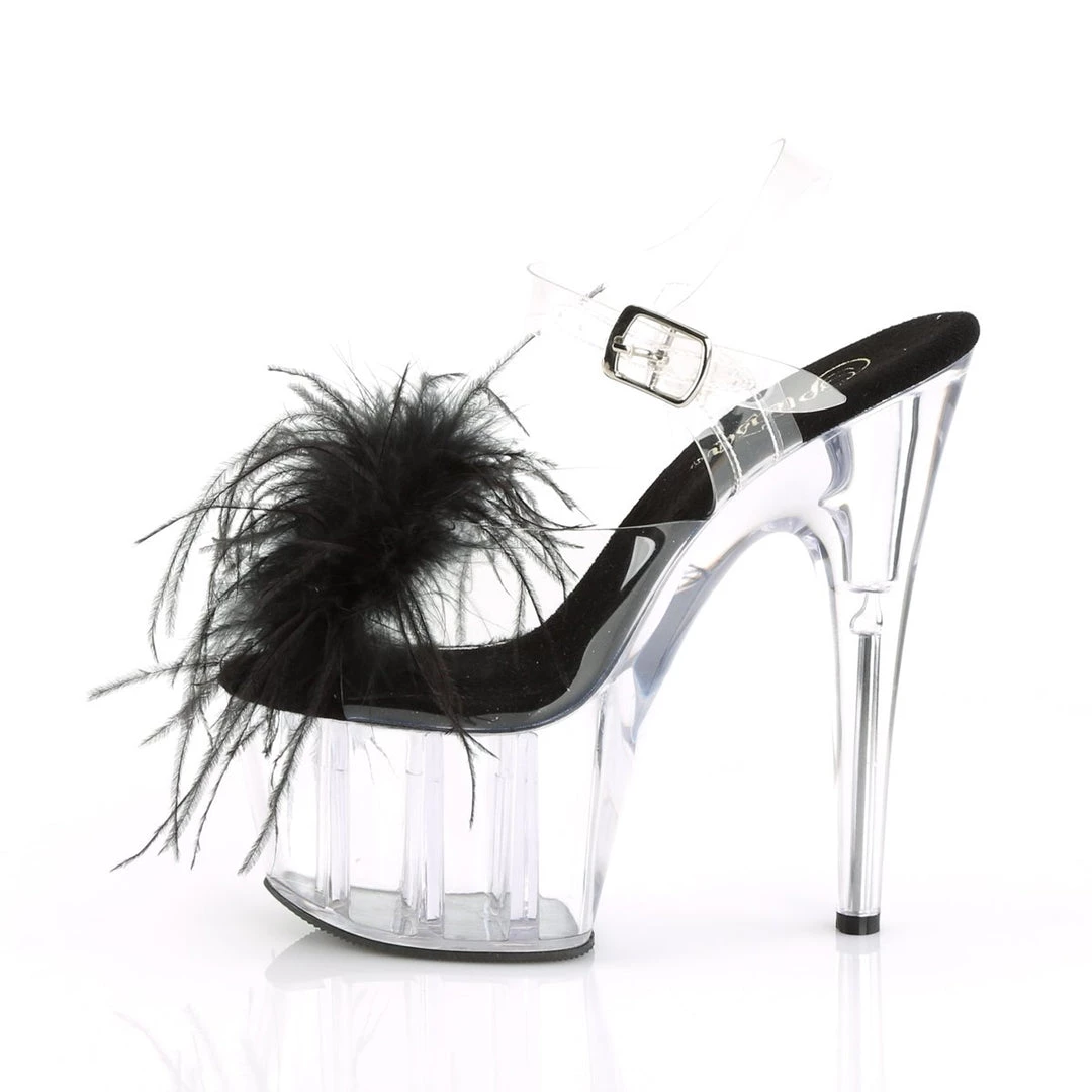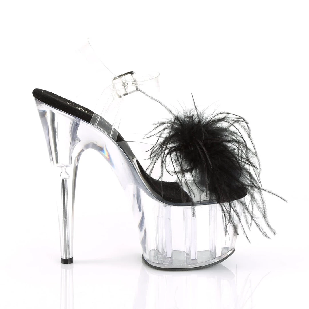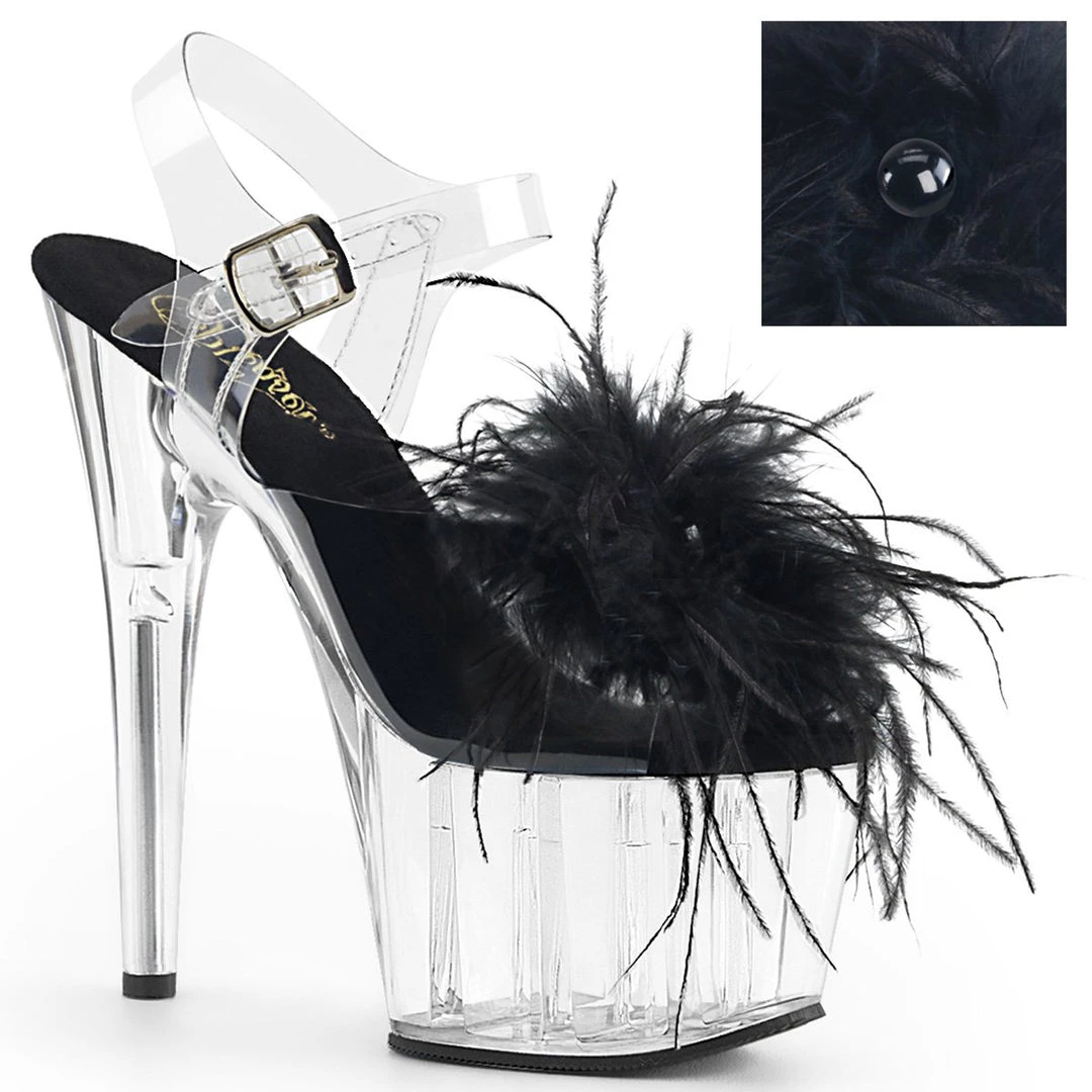 Be decadent in these fun 7″ (178mm) heel, 2 3/4″ (70mm) platform ankle strap sandals featuring Marabou feather puffs on vamp with pearl ornament.