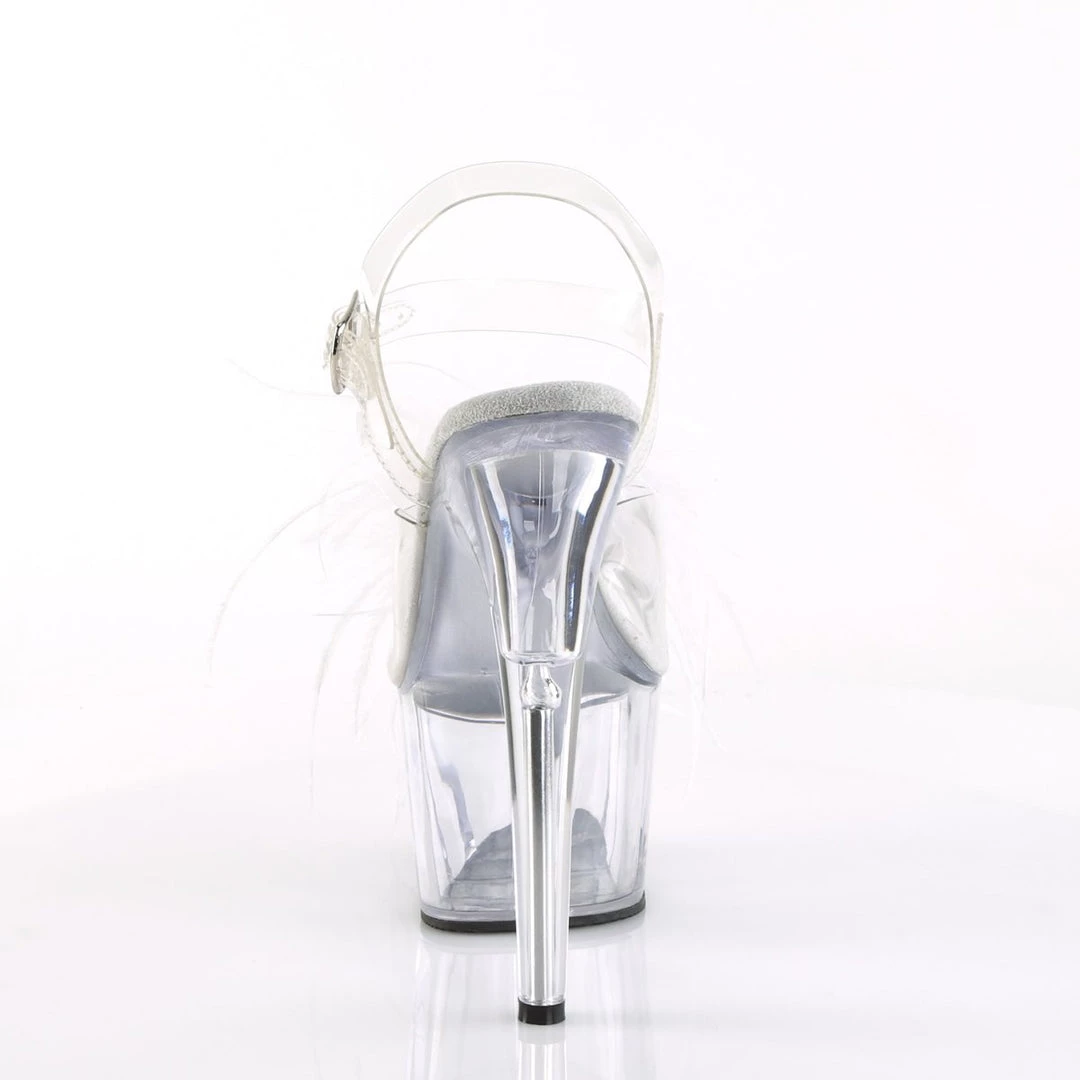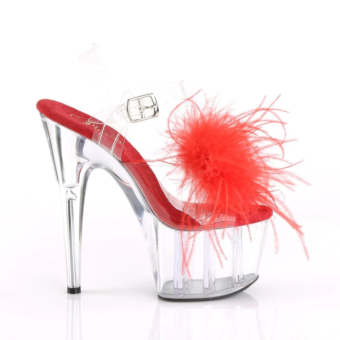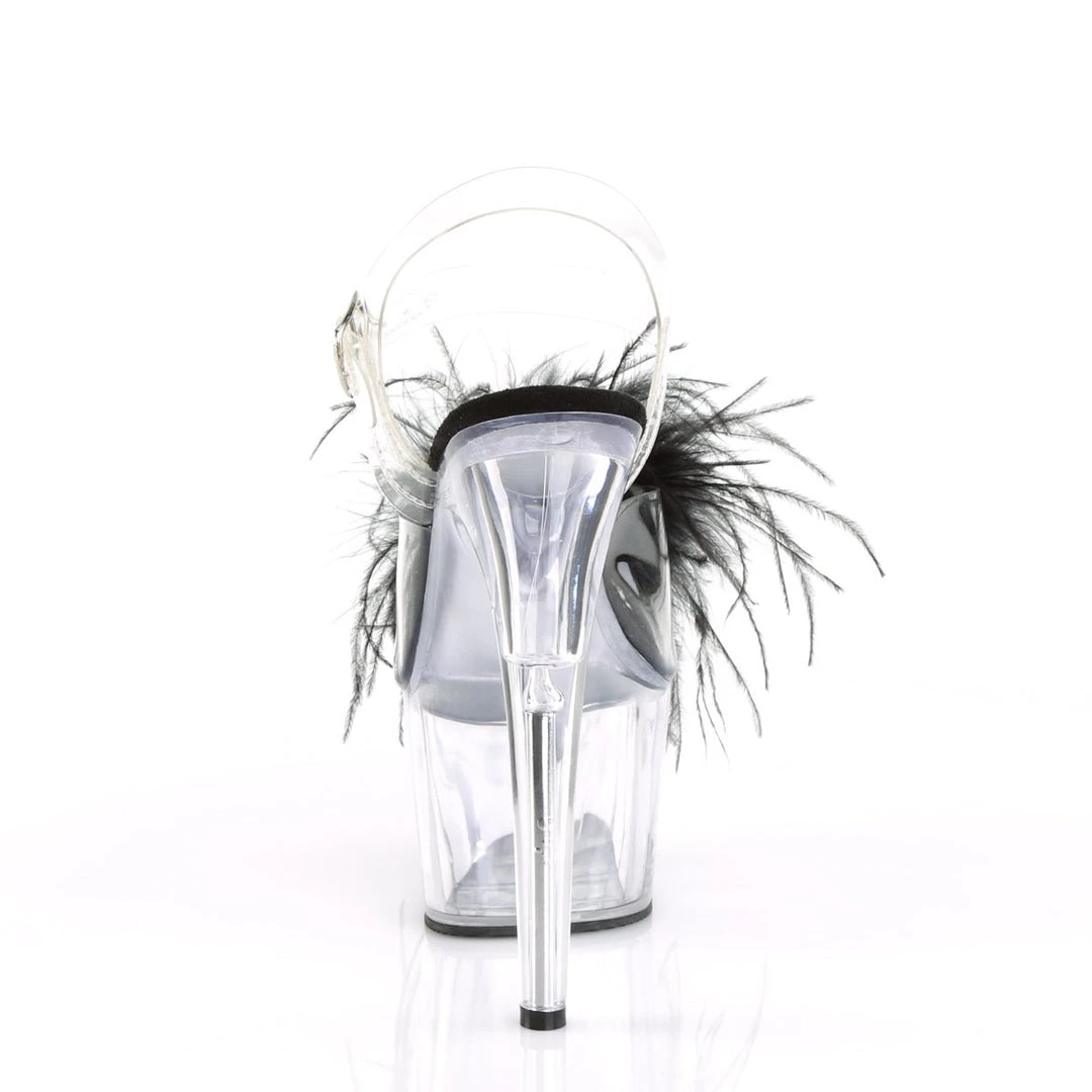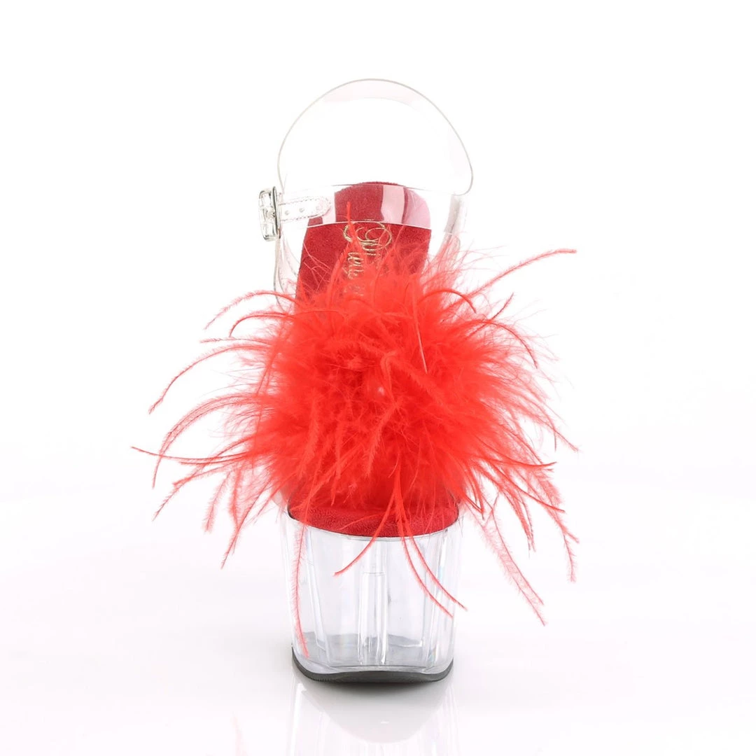 Be decadent in these fun 7″ (178mm) heel, 2 3/4″ (70mm) platform ankle strap sandals featuring Marabou feather puffs on vamp with pearl ornament.