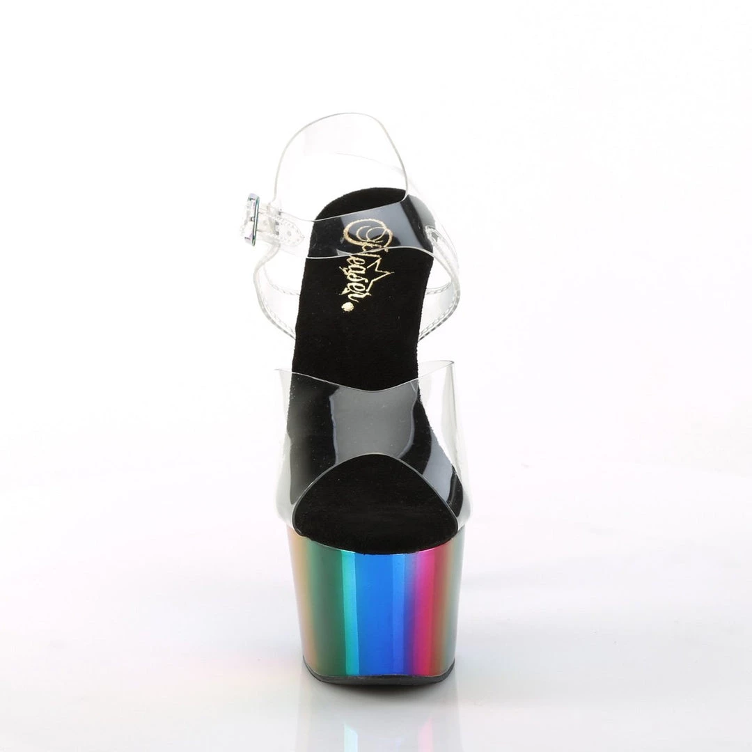 Gorgeous 7″ (178mm) heel, 2 3/4″ (70mm) platform ankle strap sandal featuring rainbow chrome plated platform bottom.