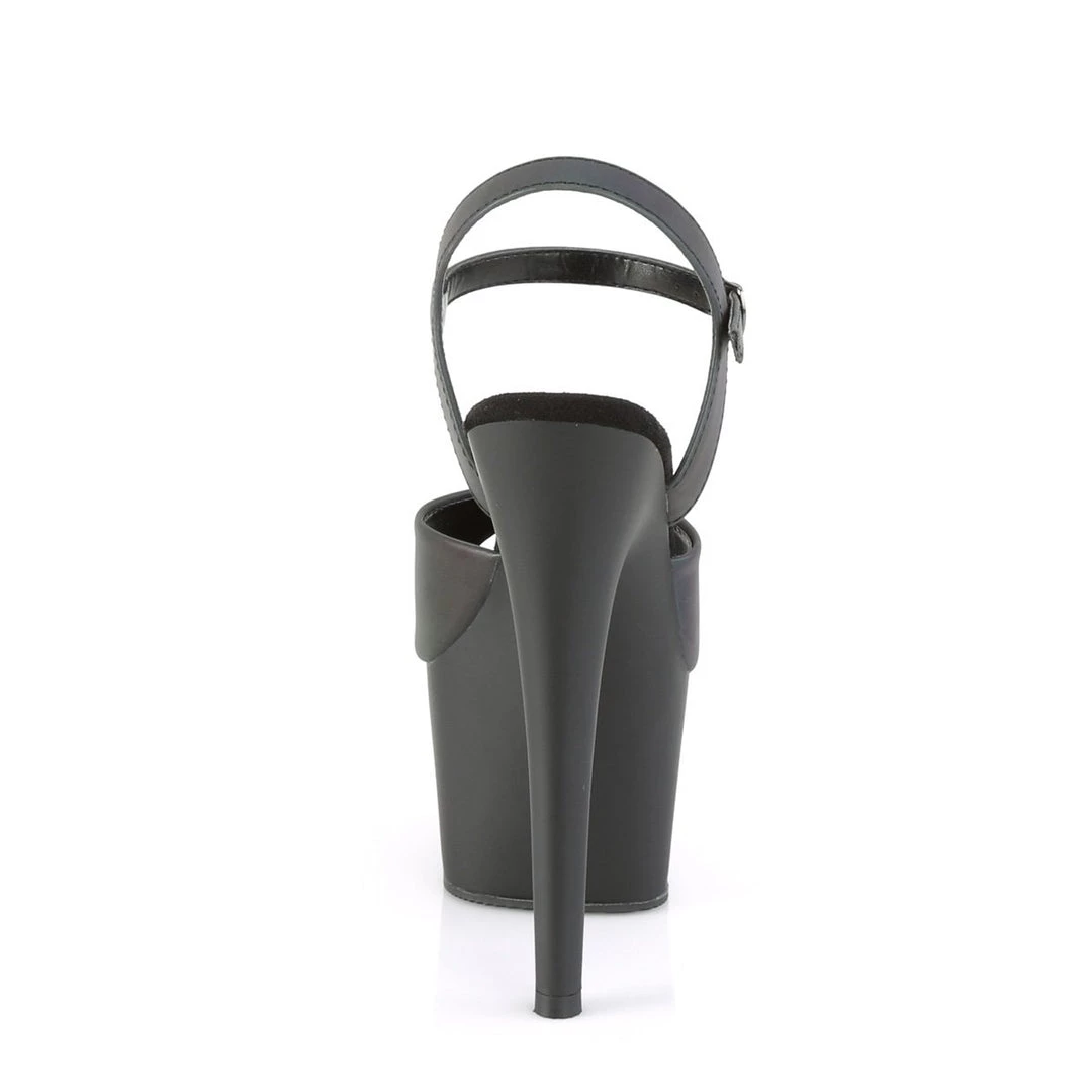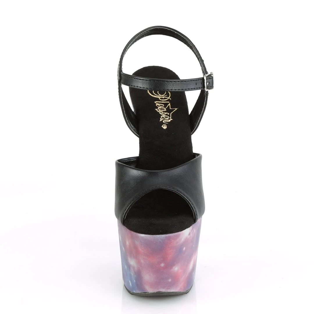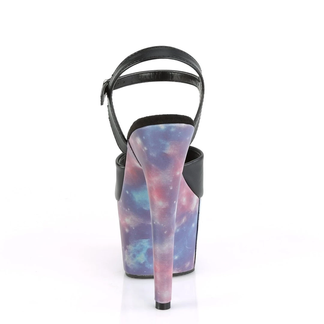 Out of this world 7″ (178mm) heel, 2 3/4″ (70mm) platform ankle strap sandal featuring reflective galaxy effect wrapped platform bottom.