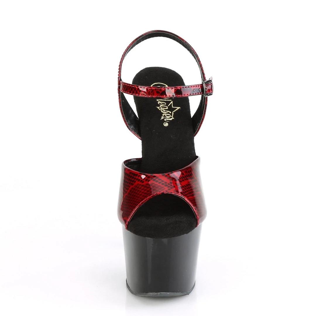 Sleek 7″ (178mm) heel, 2 3/4″ (70mm) platform ankle strap sandal featuring oil slick holographic snake print upper and matching snake print wrapped platform bottom.