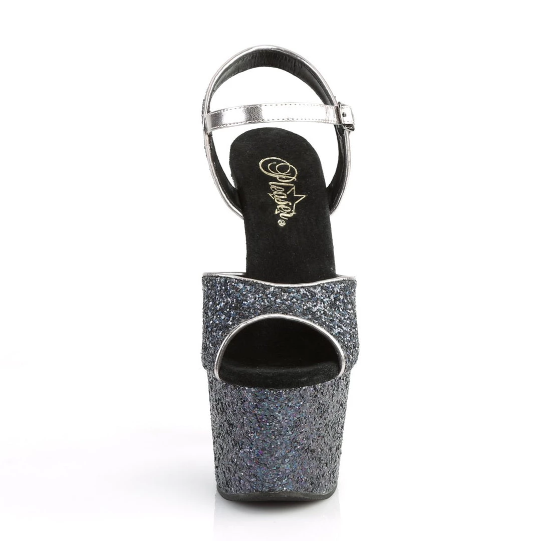 Sparkle with style in these 7″(17.8cm) heel, 2 3/4″(7cm) platform ankle strap sandals featuring holographic glitter upper & platform bottom.