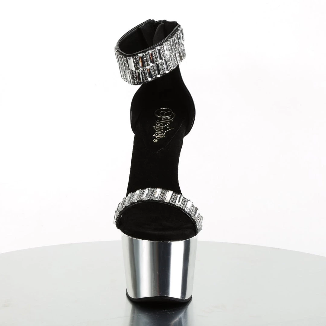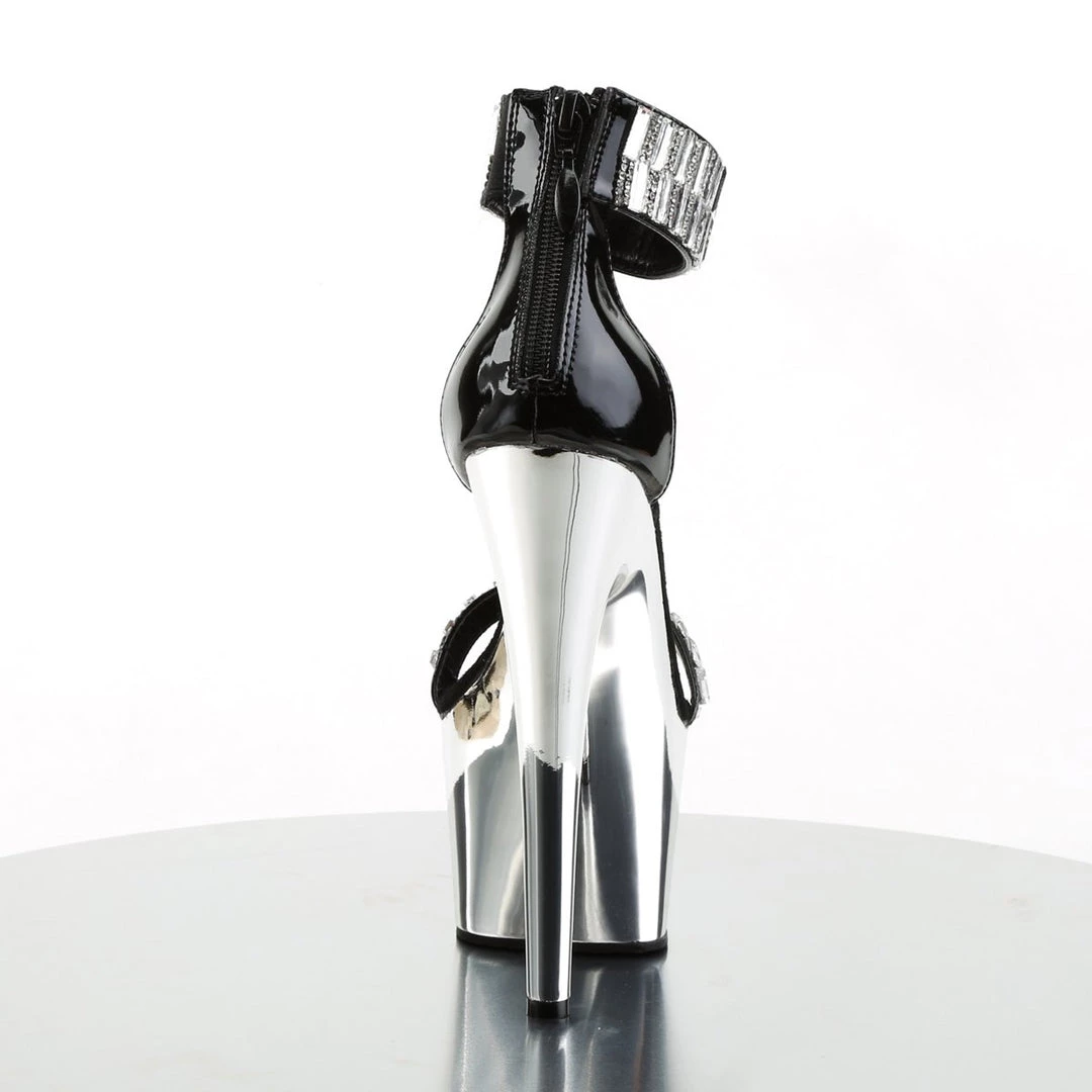 7″(17.75cm) Heel, 2 3/4″(7cm) Chrome Plated Platform Closed Back Sandal Featuring Rhinestone and Mirrors Embellished All Over Ankle Cuff & Toe Strap, Back Zip Closure.