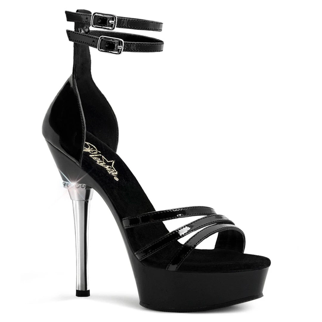 Black patent sandals with asymmetric straps in toe area, heel support onto which are attached two ankle straps fastened with metallic buckles, solid black front platform and textile cushioning on sole. The 6 inch (15 cm) high heels present metallic finishing, chic sculptured design and clear rhinestone adornment on top part.