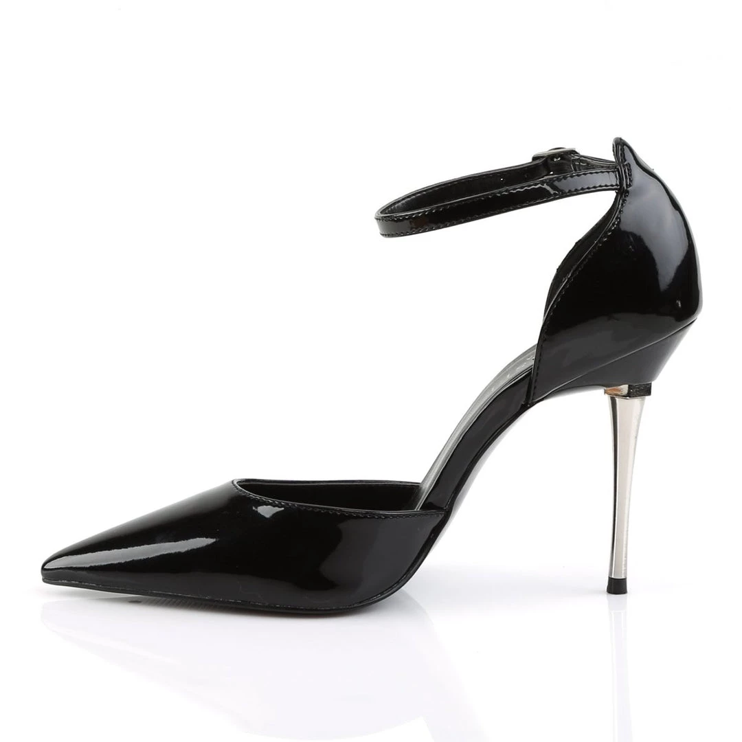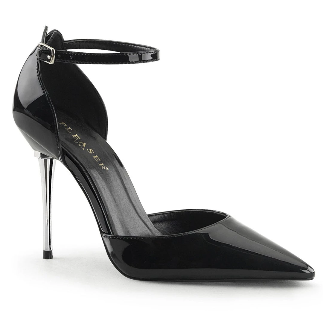 Sleek and sexy 4″ (10.2cm) metal stiletto heel ankle strap pointed toe d’Orsay pump. Perfect for a night out!