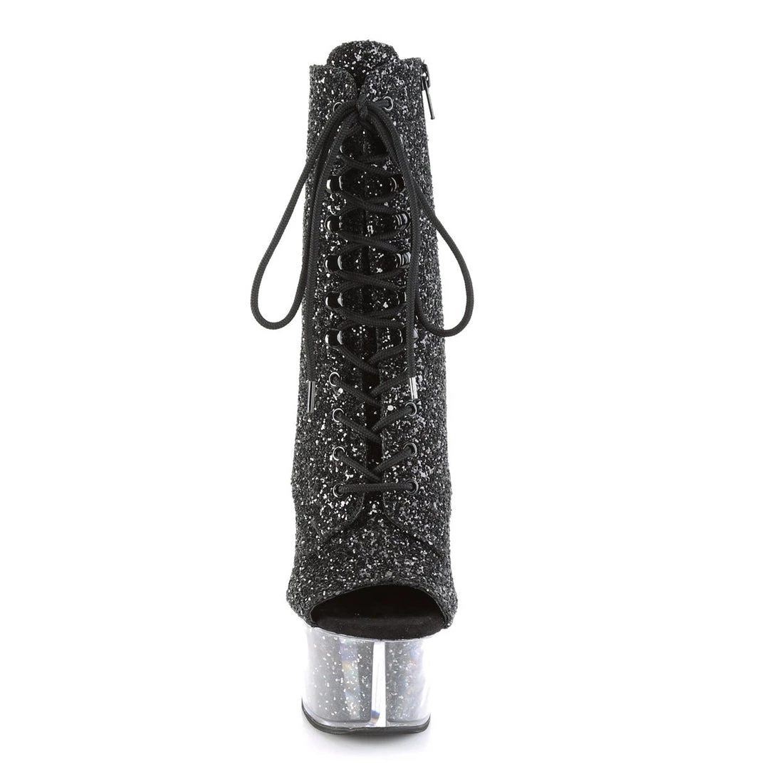 Sparkle in these gorgeous 6″ (152mm) heel, 2 1/4″ (57mm) platform open toe lace-up front ankle boot featuring matching glitter inserts in the platform bottom with inside zip closure.