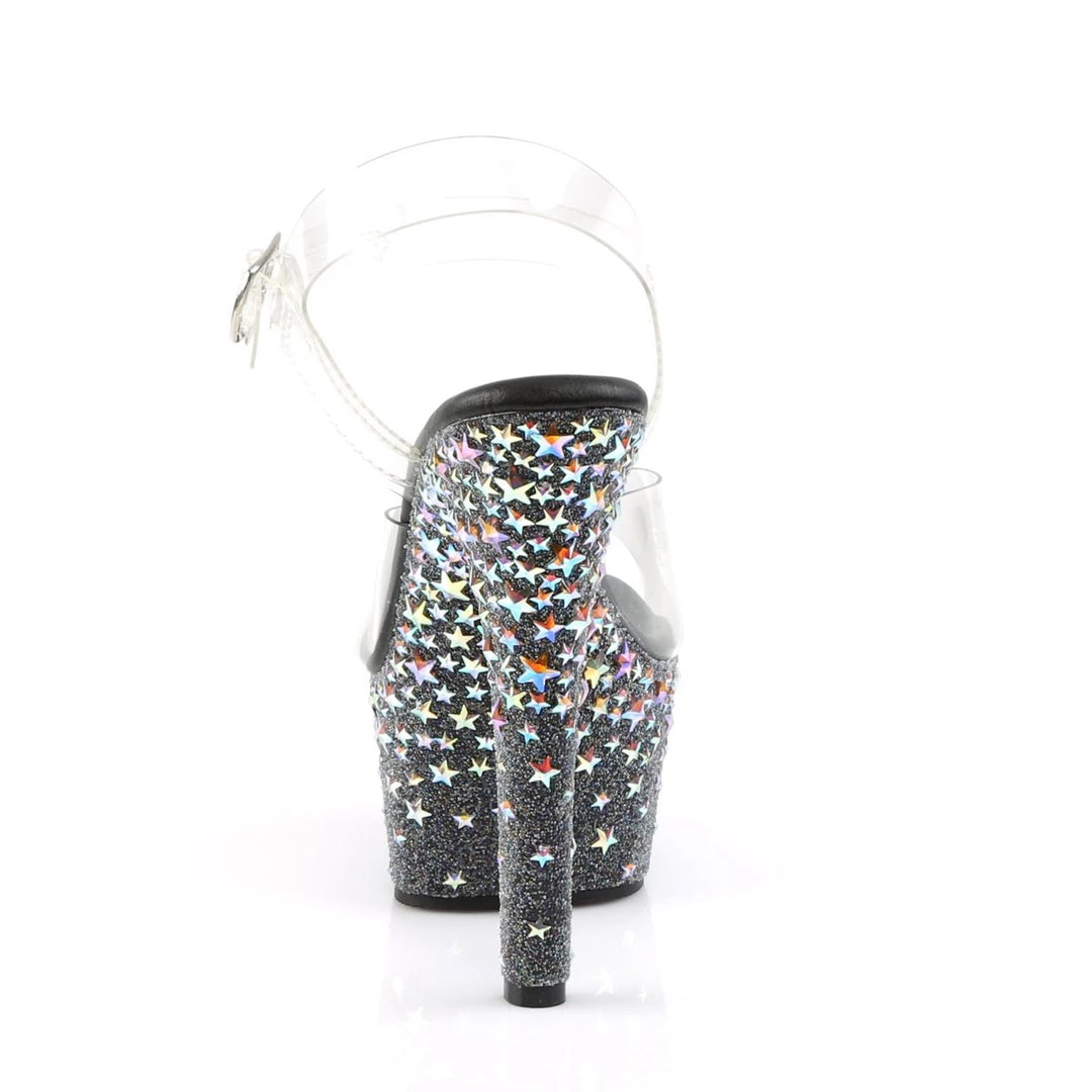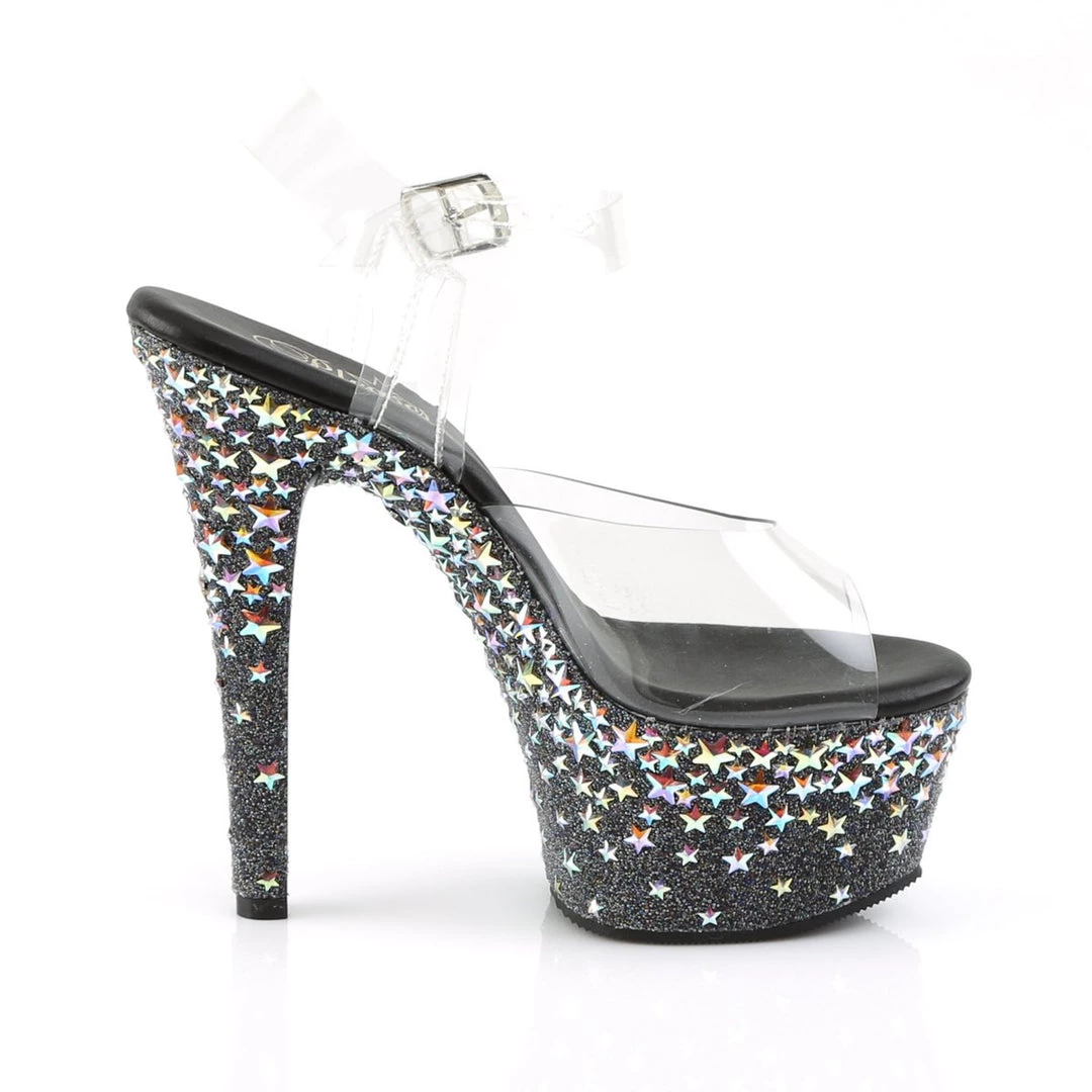 6″ 15.25cm Heel, 2 1/4″ 6cm Platform Ankle Strap Sandal Featuring Vegan Leather Insole and Silver Hologram Stars on the Bottom