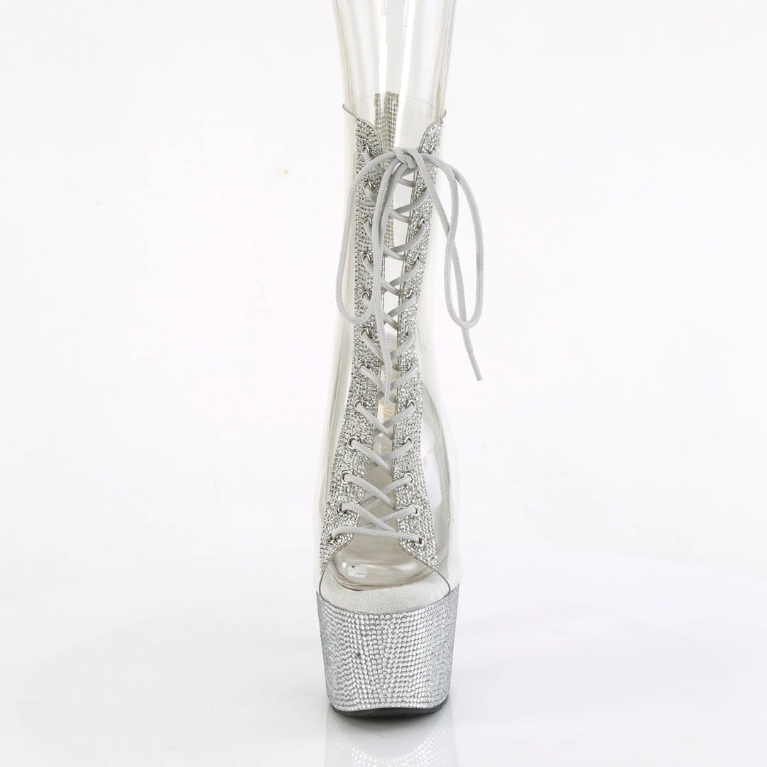 Shiny and glimmering sandals for a fun dance party! A 7″ (178mm) heel, 2 3/4″ (70mm) platform open toe/heel lace-up front ankle boot with w/silver rhinestone embellishment along center front & back featuring rhinestones encrusted all over the entire platform.