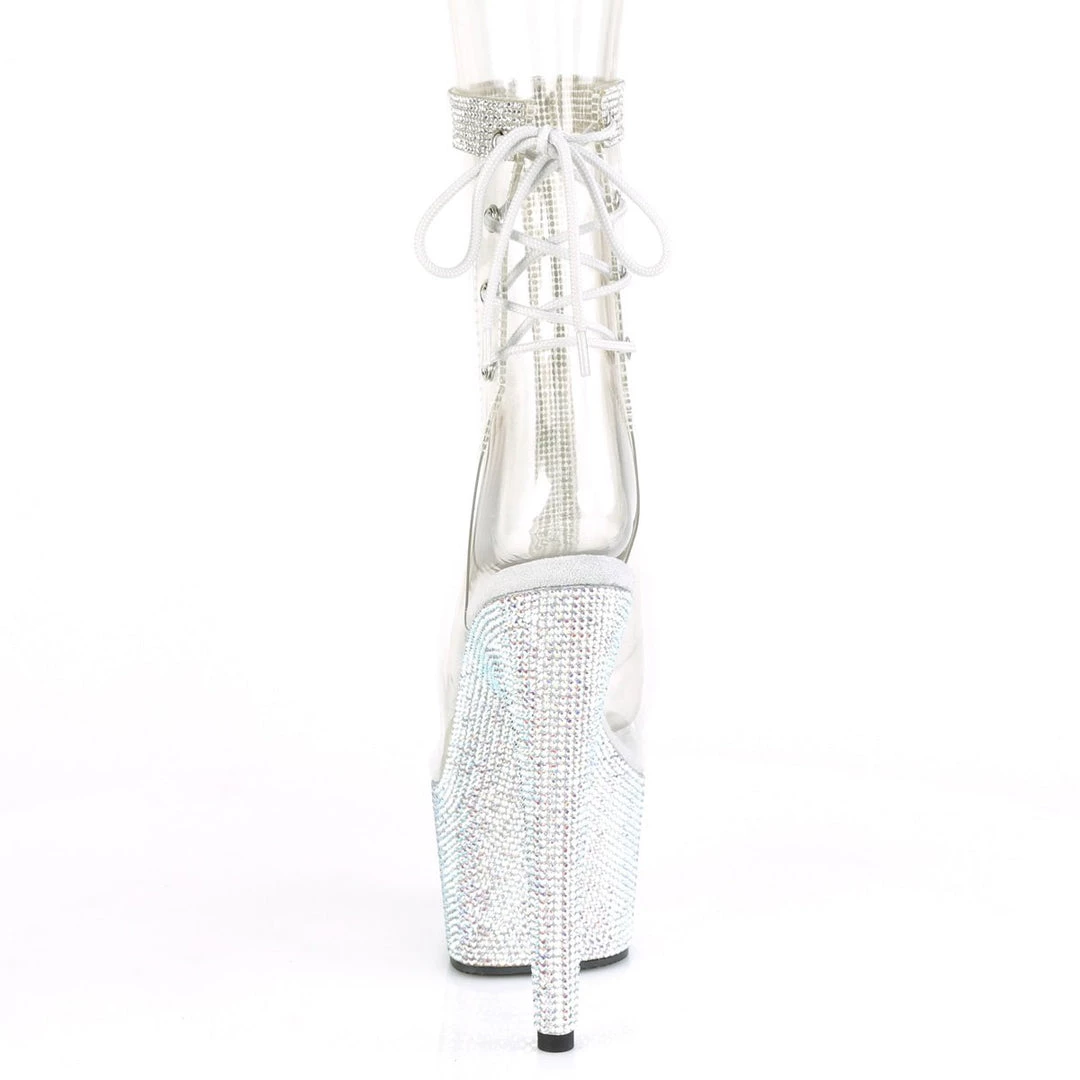 Simply gorgeous 7″ (178mm) heel, 2 3/4″ (70mm) platform open toe/heel lace-up back ankle boot featuring rhinestone embellishment along center front, ankle opening & platform bottom.