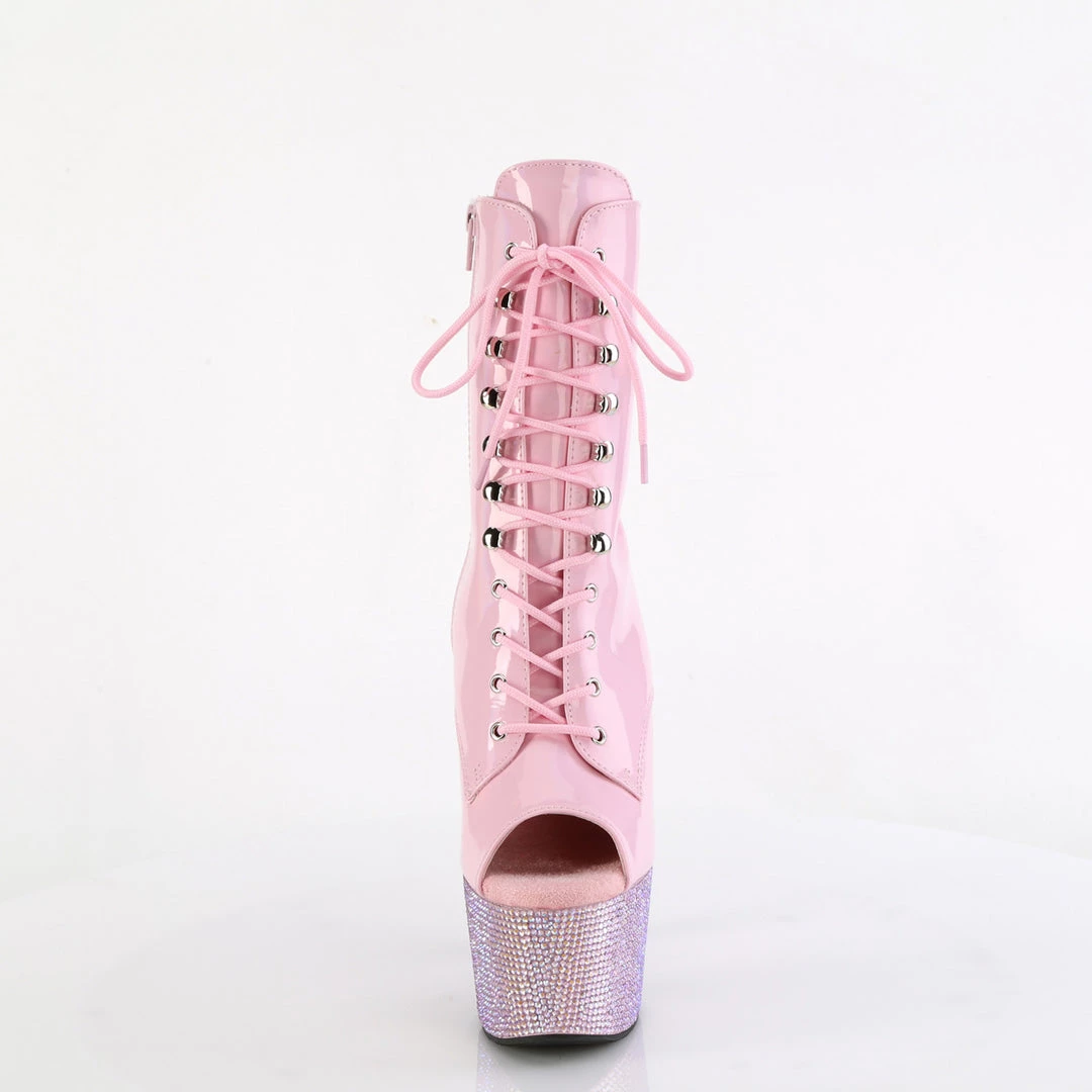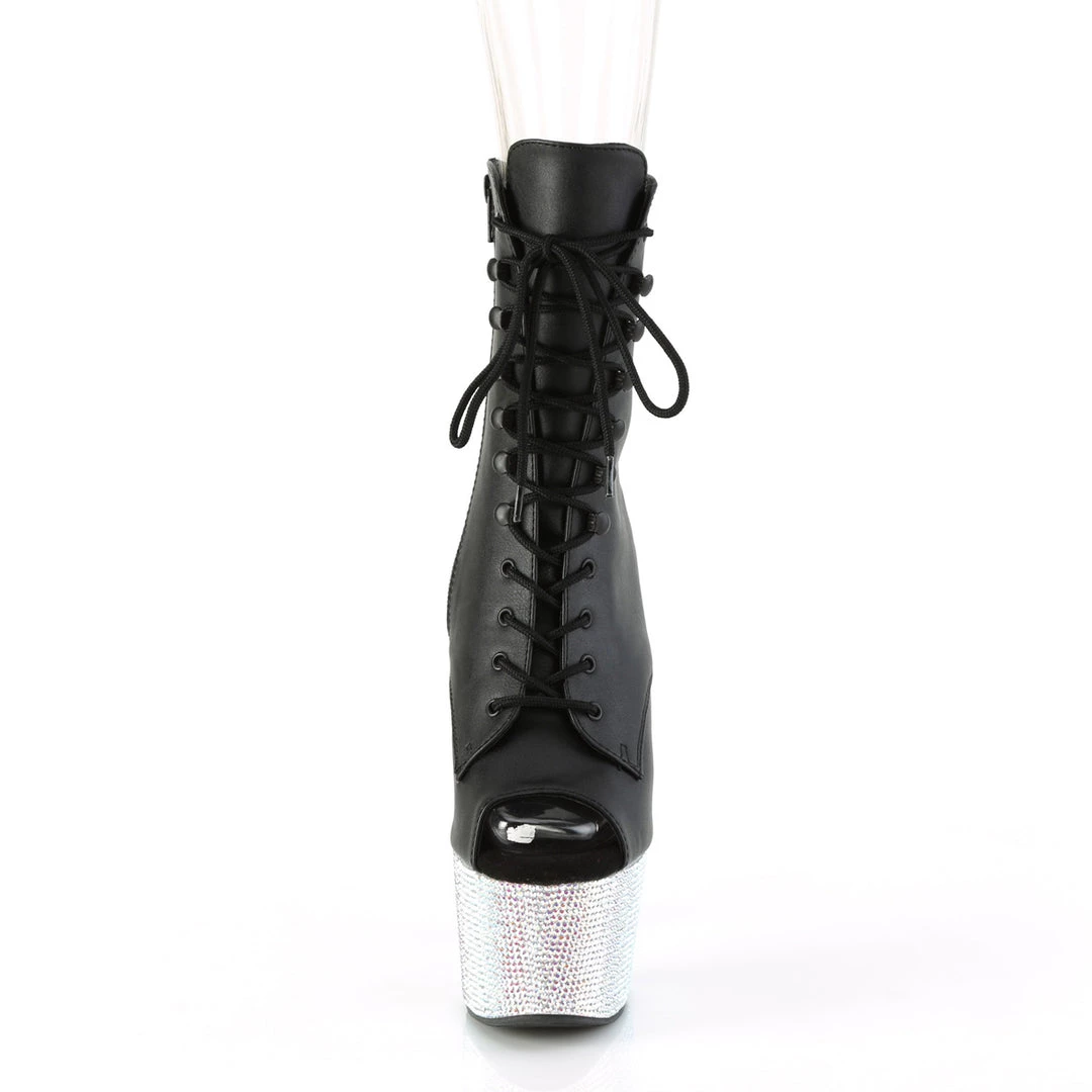 Grab that fab look! A 7″ (178mm) heel, 2 3/4″ (70mm) platform peep-toe lace-up front ankle boot featuring silver AB rhinestones encrusted all over the entire platform bottom, inner side zip closure.