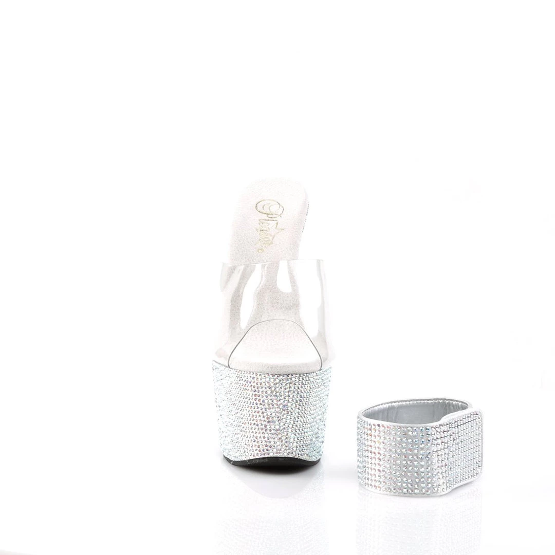 Sexy crystal-adorned platform sandals with crystal adorned ankle cuff strap. Indulge yourself in radiance and luxury with these clear open toe sandals that feature a 7″ heel, 2 1/2″ platform and adjustable ankle strap, with silver multicolored rhinestones.