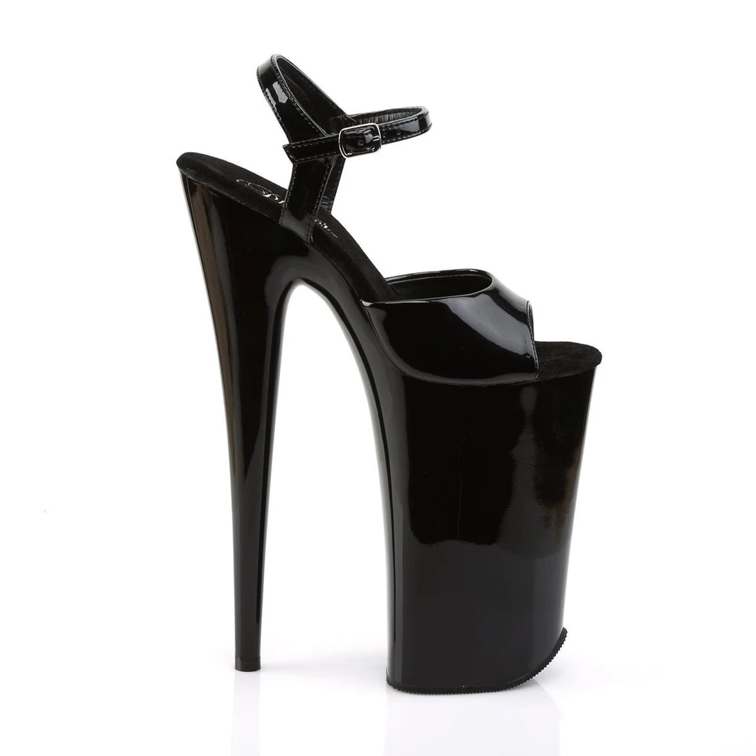 Simple, yet so stunning, these fetish sandals add length to your feet and sexiness to your look! They are made in black patent with single toe strap, ankle strap with adjustable length and metallic buckle closure on side and padded sole for a comfortable wear. The 10 inch (25 cm) high stiletto heels are balanced by a front high platform which ensures stability.