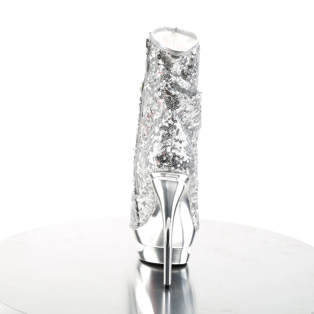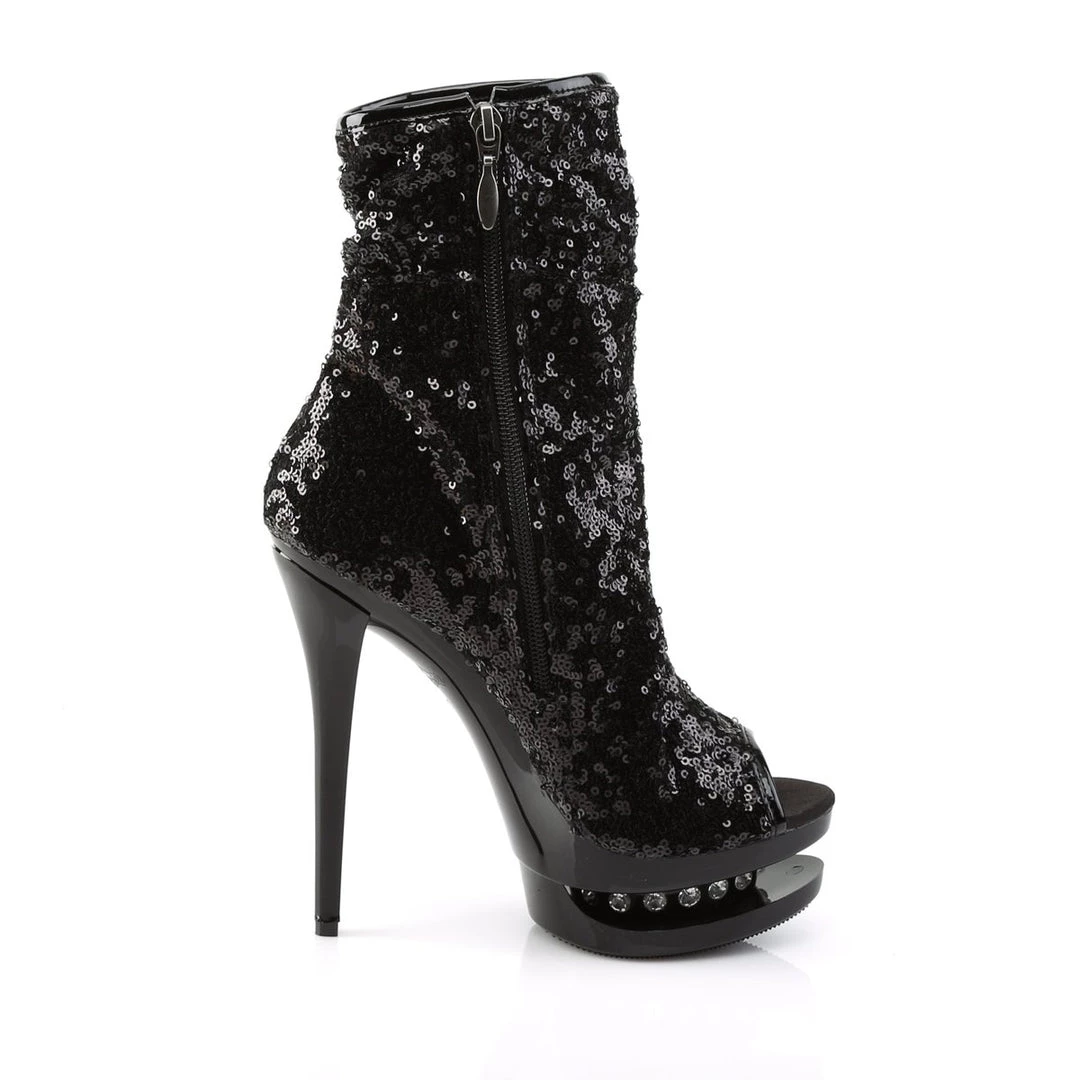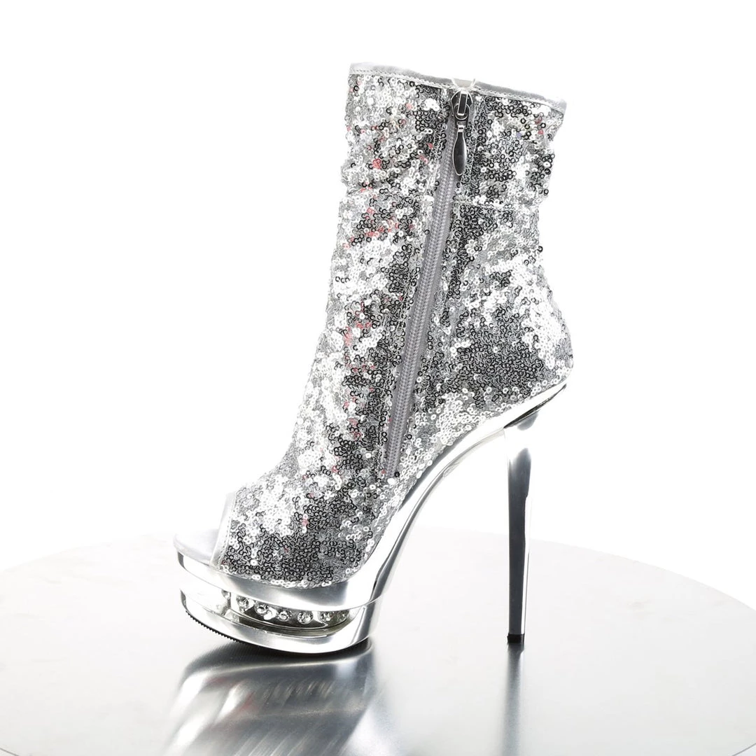 Elegant ankle-high boots covered in sparkling sequin. Open toe and double platform with rhinestone embellishment in between the two platform layers. A full zipper positioned on the inner side enables an easy put on and take off.