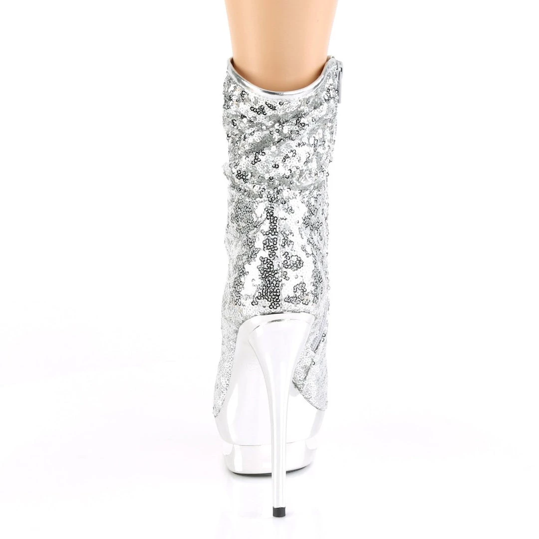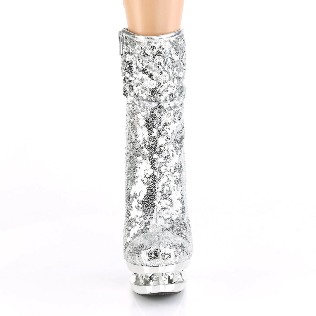 Turn heads in these 6″ (152mm) heel, 1 1/2″ (38mm) platform two tone ruched sequined ankle boots featuring rhinestone accents in mid platform with inside zip closure.
