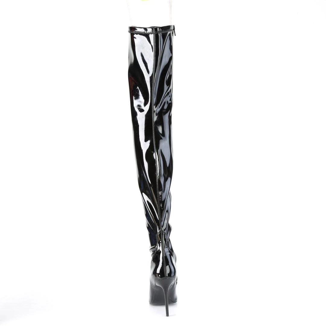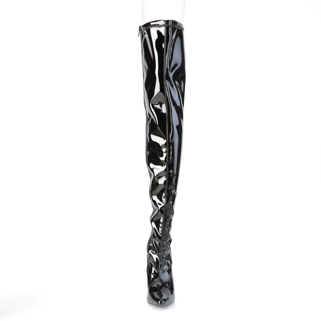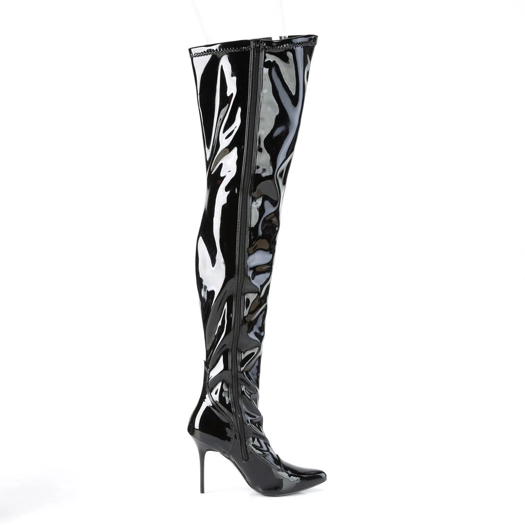 Sleek & sexy 4″ (102mm) heel stretch thigh high boot with inside zip closure.