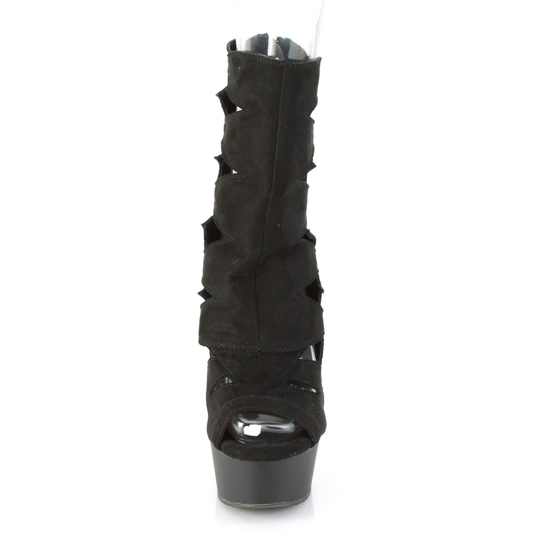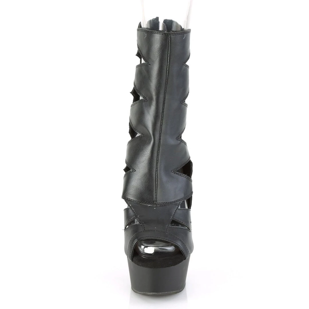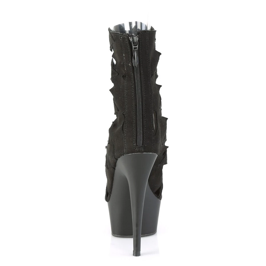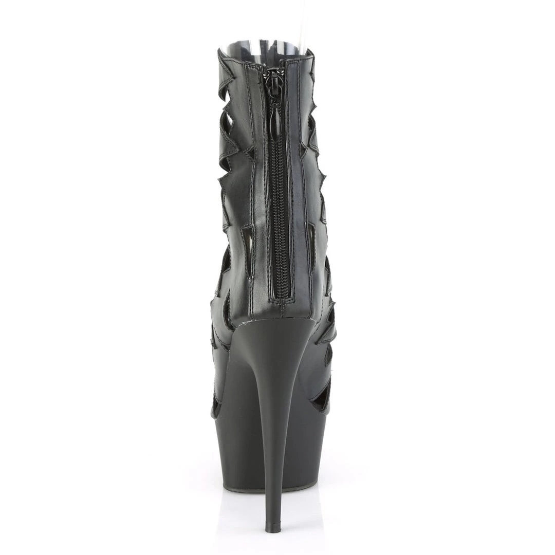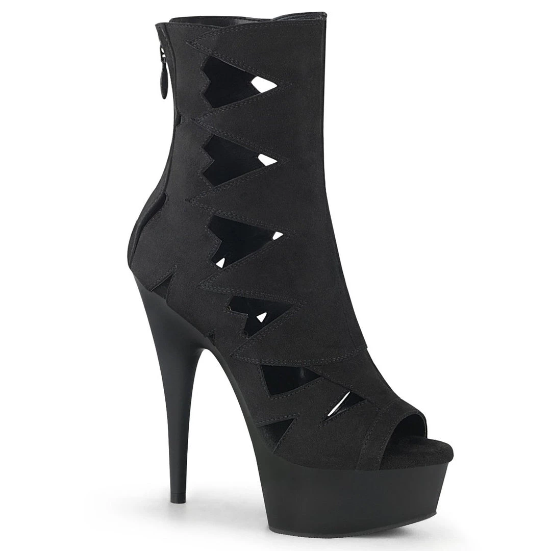 Unique look and super sexy! 6″ (152mm) heel, 1 3/4″ (45mm) platform peep toe cutout ankle boot with back zip closure.