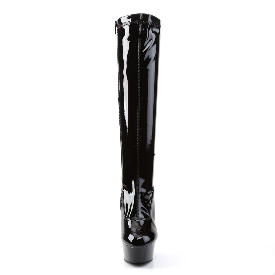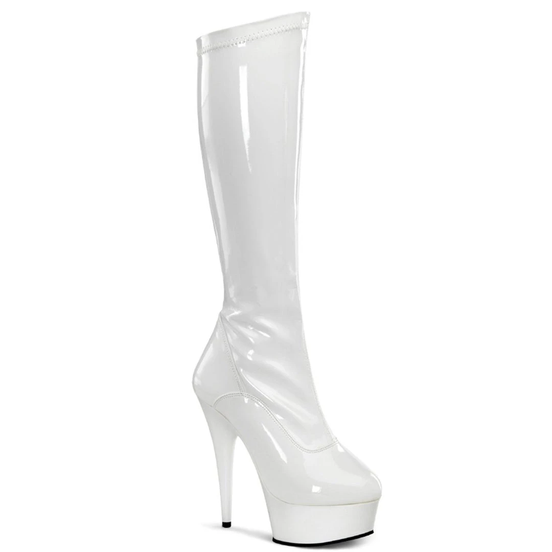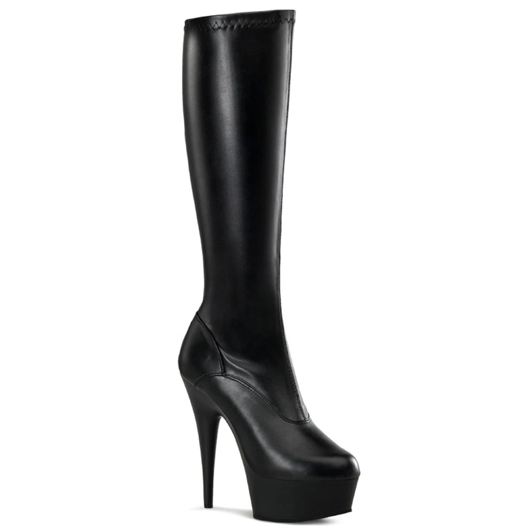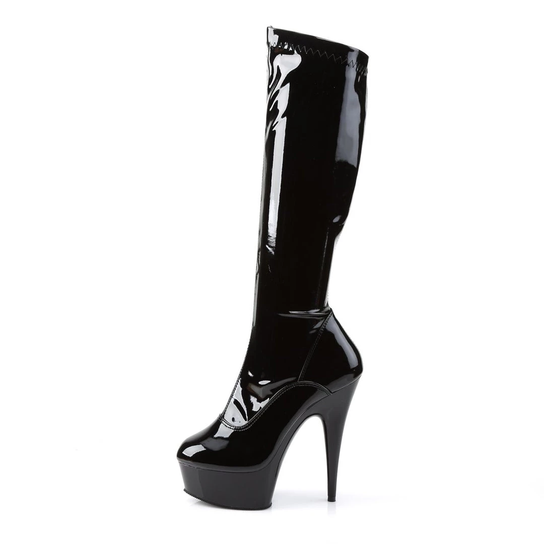 Stretch knee high platform boots with stiletto heel, rounded toe and size zipper that wraps the leg for a perfect fit, preformed bottom for a comfortable wear, 6 inch style heels and a matching front platform which measures 1 3/4 inch. Stable, comfortable and provocative, they are perfect for dress-ups and thematic looks.