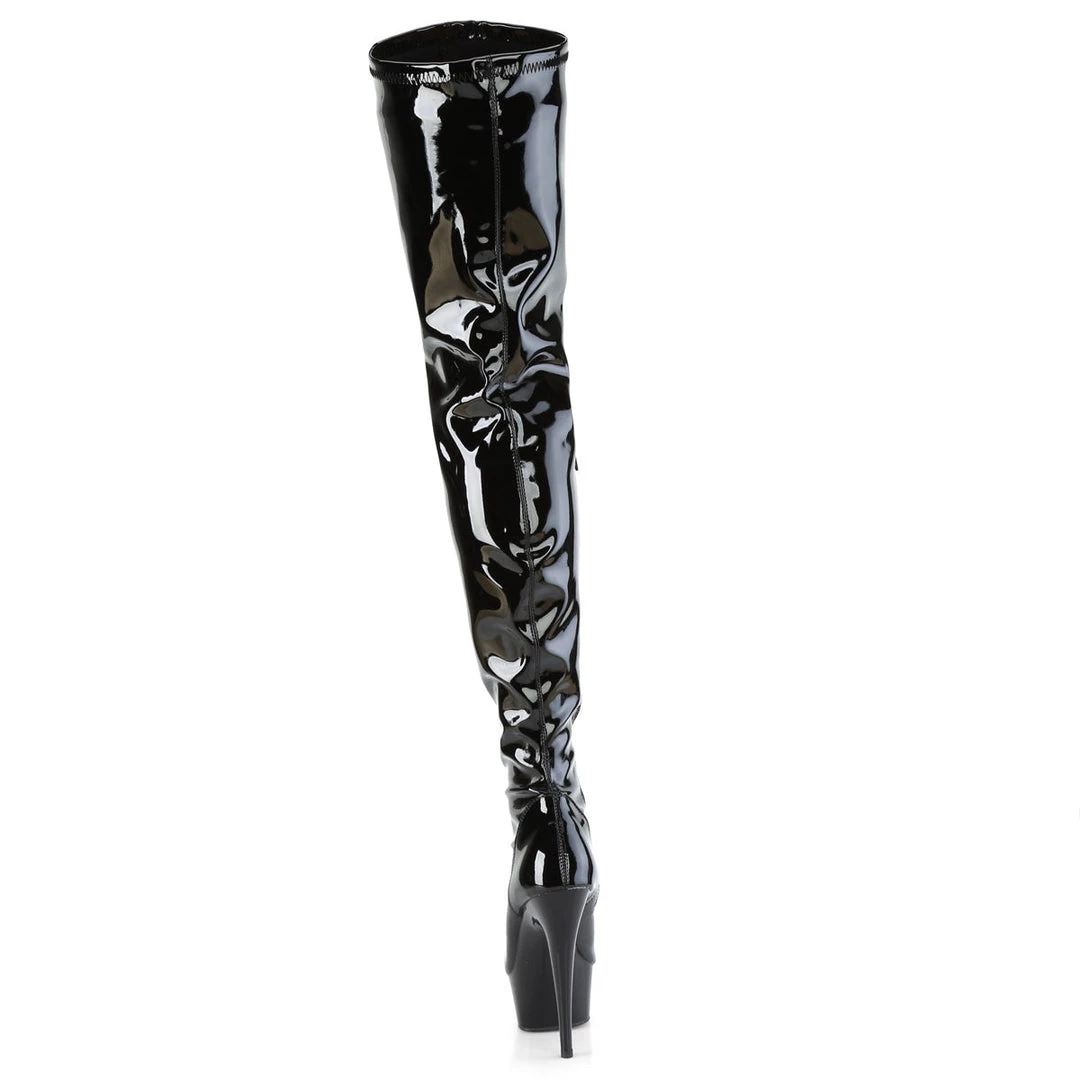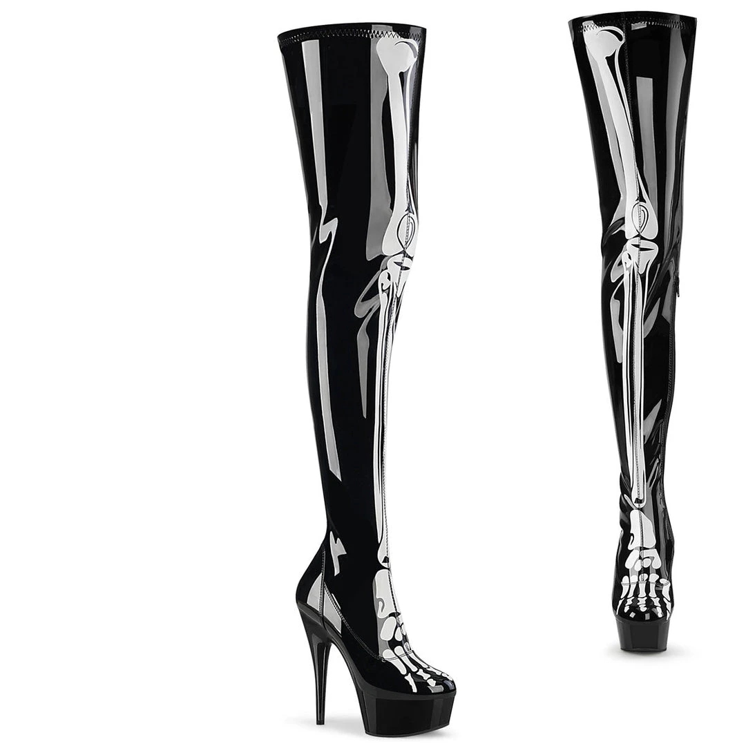 Grab your skeleton-related pairs! A spooky 6″ (152mm) heel, 1 3/4″(45mm) platform stretch thigh high boot featuring skeleton leg bone print on the front, full-length inside zip closure.
